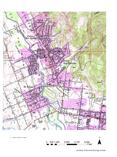The plat of Leavenworth’s claim was drawn in 1860 by the US Surveyor General in SF. Near the center is a small square with the inscription “Leavenworth’s house.” Also on the plat are the township and range lines of the Public Land Survey System, with their alpha-numeric designations(“T5N R6W”). This system is still in use, allowing the US Geological Survey quadrangle map to be superimposed on Leavenworth’s plat. Ecological historian Arthur Dawson has done just that, writing in the names of the streets as we know them today(Queens, or Queeno street is the un-signed alley that runs along the south side of the Sonoma Mission Inn property.)
