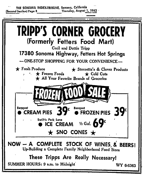 The store at the corner of Highway 12 and Depot Road in Fetters Hot Springs has been important in that community since at least the 1950s. Fetters Food Mart is first mentioned in the Index Tribune in 1952. The owner at that time is not mentioned, but we know that changed in 1956 when Mr. and Mrs. Roger Cleland sold to Mr. and Mrs. Victor Frolich, “formerly of Lodi.”
