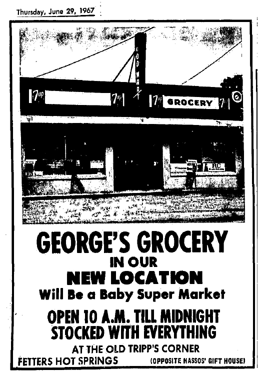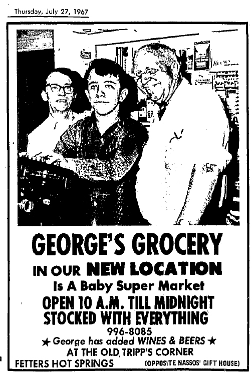 And in June 1967, “George Raby has taken over the former Fena’s Grocery at 17380 Sonoma Hwy., Fetters Springs. To be known as George’s Grocery, the store is on the corner of the road that goes down to Flowery School and is directly opposite Mountain Avenue. Raby formerly operated a grocery store in Boyes Springs and prior to that had one at Hooker Oaks.”