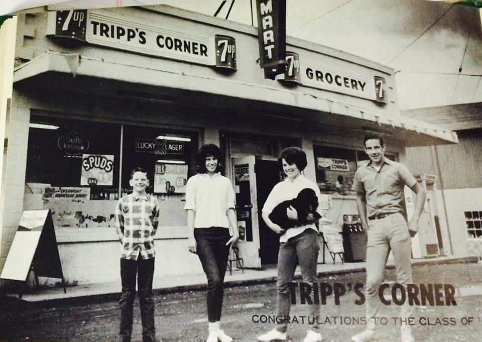 Sharon Williams via Facebook: “This great photo was in the Our Supporter’s section of the 1965 El Padre. It is Tripp’s Corner Grocery, on Hwy 12, and we have Shirleen (Tripp) Perry (class 1966,) her brothers, plus Robin Dodson (1966) holding the dog.” (Cecil Tripp, owner, is at right.) The Nasso’s building can be seen in the background.