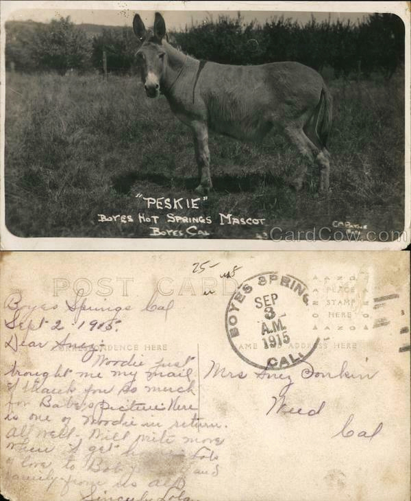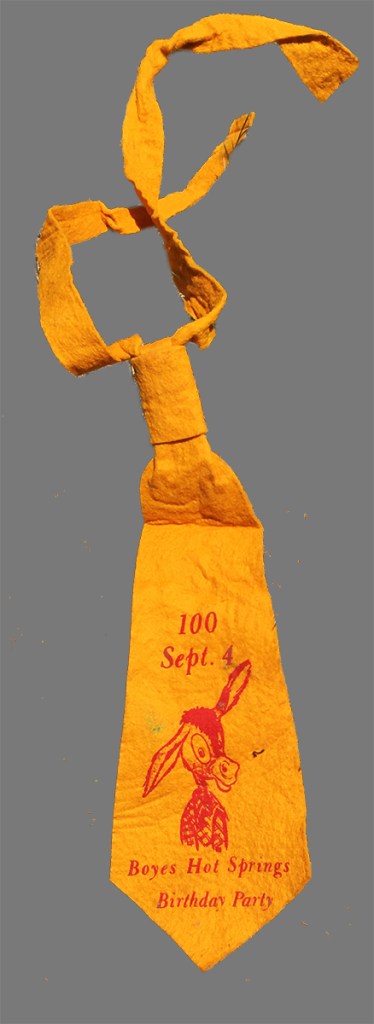 The commemorative tie features the image of a mule because that was the mascot of Boyes Springs at the time. Mules live long lives, but it’s doubtful Peskie was still there in 1949.
