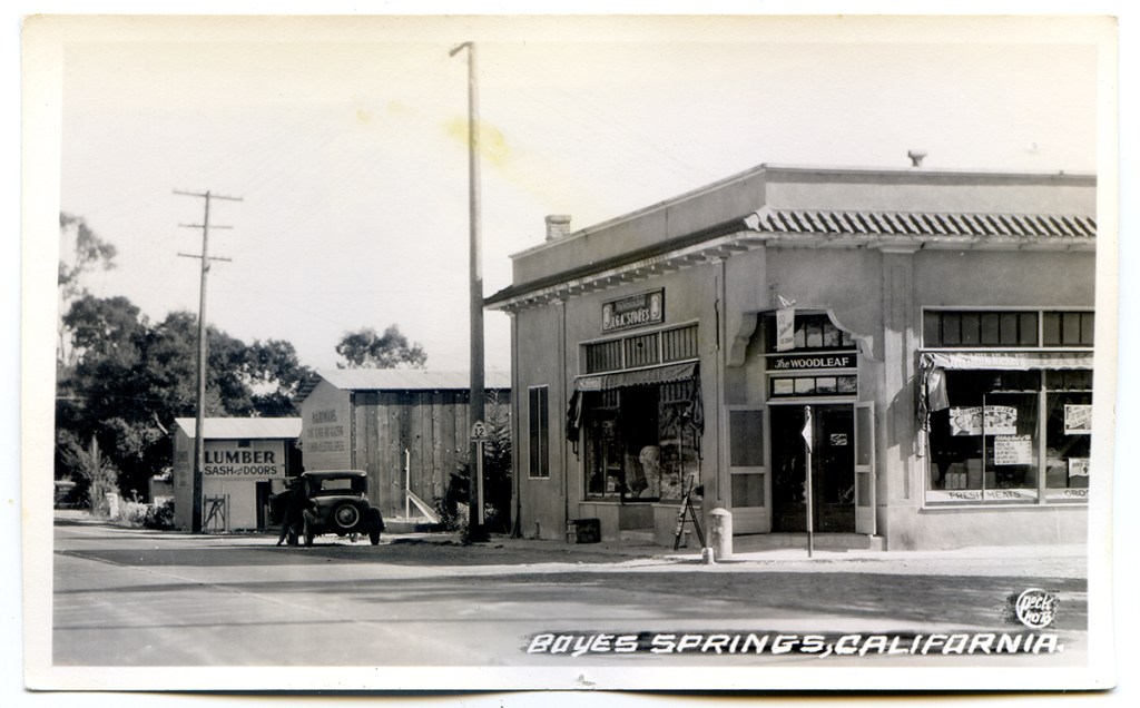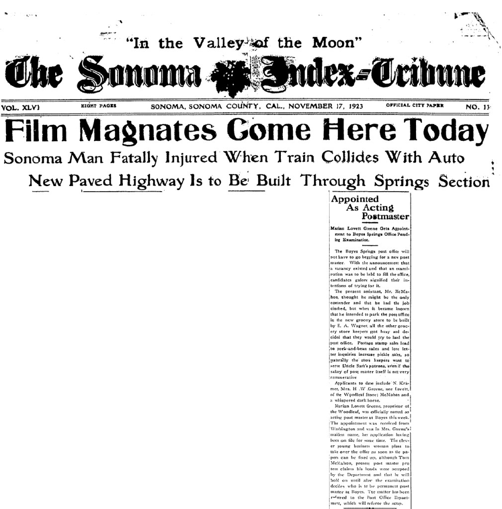 In November of 1923, Marion Lovett Greene, proprietor of the Woodleaf Store, was appointed acting post master of the Boyes Hot Springs post office and was waiting to take the exam to qualify as the permanent post master. There as quite a bit of competition for the job among local grocers, the Index Tribune noted. ”Postage stamp sales lead to pork-and-bean sales and love letter inquiries increase pickles sales, so naturally the store keepers want to serve Uncle Sam’s patrons, even if the salary of post master itself is not very remunerative.” She did become the regular post master and stayed in the job until at least 1939.