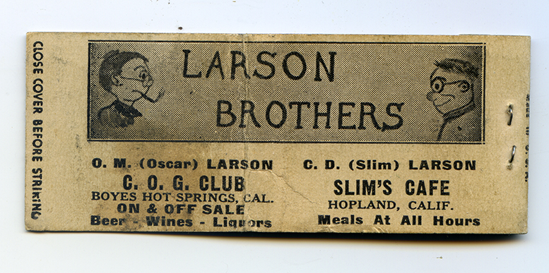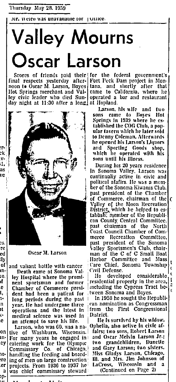 In April of 1939 the Index Tribune reported “The Larson brothers of Hopland have leased “Keller’s” at Boyes Hot Springs.” The Larson family, including Oscar’s wife Ophelia, came to California from Wisconsin around 1939.