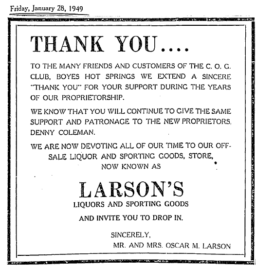 In 1949 Oscar and Ophelia Larson sold the club to Denny Coleman to concentrate on running Larson’s Sporting Goods and Liquor store, which he had opened in 1945, next door to the club.