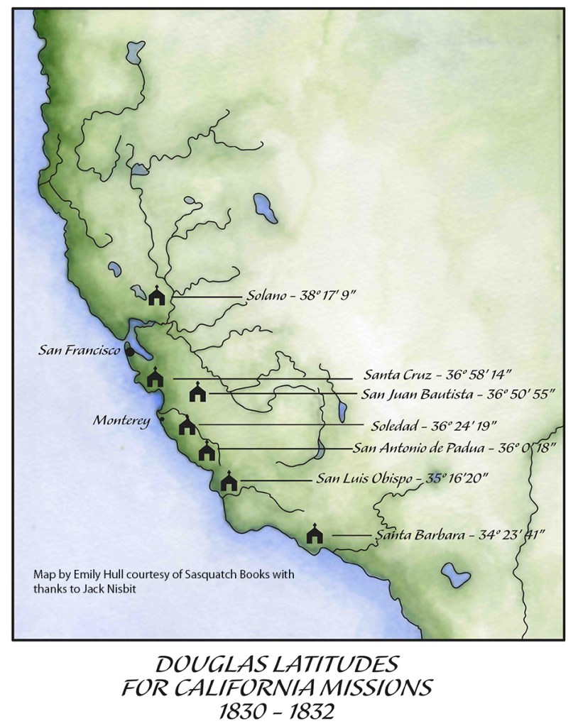 Back in London in 1827, Douglas had trained in surveying with geographer and astronomer Edward Sabine. On his 1829 return voyage around the Horn to North America, Douglas practiced with the instruments and studied the math. He became proficient at the difficult task of measuring longitude, given the unreliability of chronometers at that time.