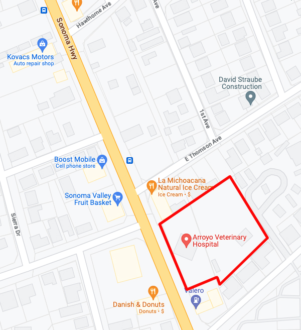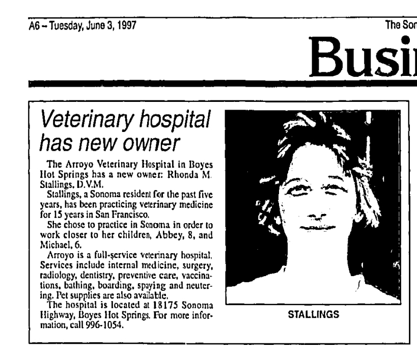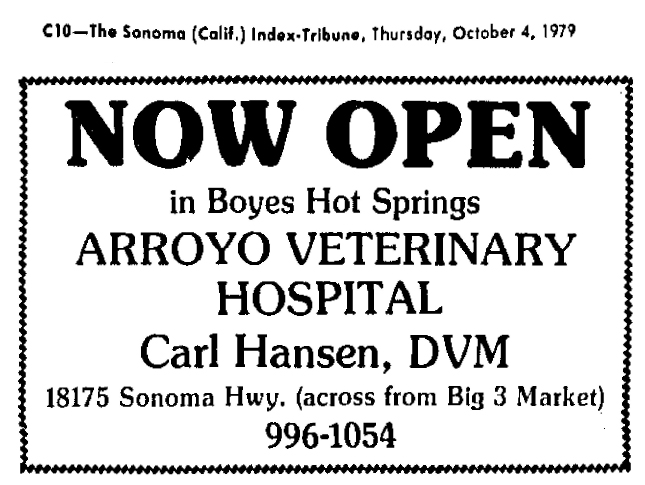 Digression the First: The original Arroyo Vet Hospital was started by Dr. Hansen 1979, in a building on Sonoma Highway at Arroyo Rd, which was probably built in the 1920s, and had housed various businesses including Becker’s Real Estate Agency. Dr. Rhonda Stallings took over from Dr. Hansen in 1997, the same year your correspondent moved into a house just a block up Arroyo Road. Imagine our sense of security knowing we could WALK our sick cat to the vet’s office. And thank you to Rhonda for saving Ralph’s life.