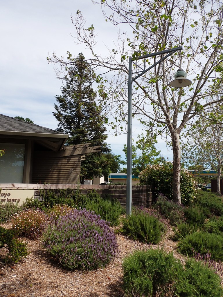 Digression the Second: The photo below shows a streetlight proposed for the Redevelopment sidewalk project. This was offered by landscape architect Ron Wellander and installed in 1997. The design was not used. It stands today, in 2023, lonely, unlit.