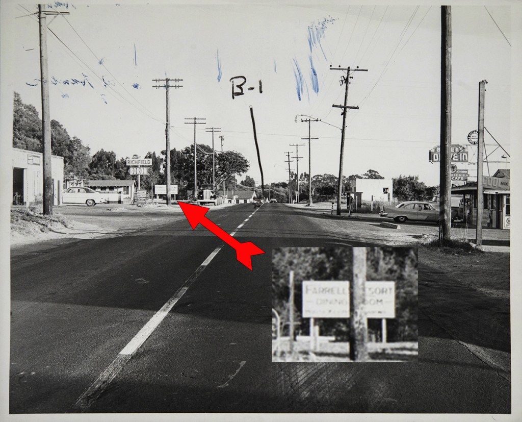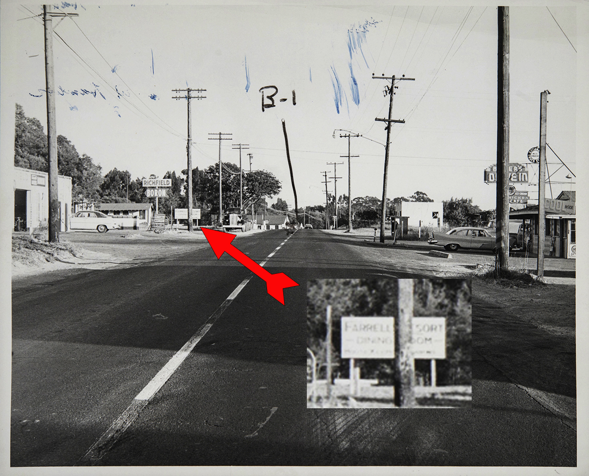 This photo is an exhibit from a lawsuit involving a traffic accident in 1958, courtesy of the Sonoma County Library. Difficult to see, at left, below the Richfield sign, half obscured by a power pole (!) is a sign advertising Farrell’s Resort. Thomson Ave (not East Thomson!) is at left. Across the highway is Baker’s Drive-In, current site of the Fruit Basket.