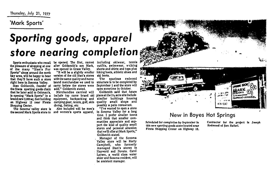 Mark’s Sporting Goods in Boyes Hot Springs, named after Stan’s son, opened in 1977. It was the second Mark’s. the first one was in Grass Valley, in an identical building.