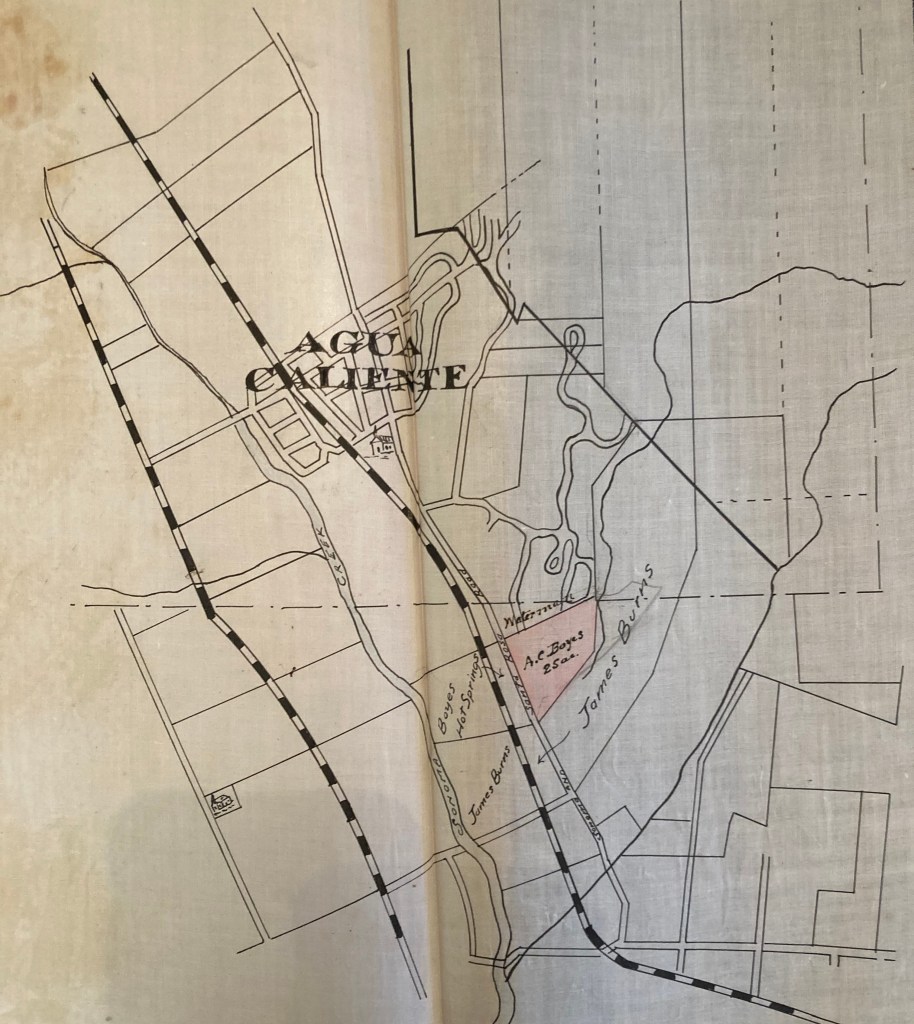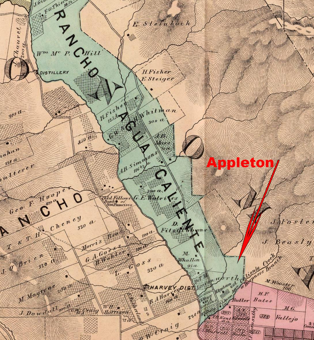 Appleton appears as a property owner on the Reynolds and Proctor maps of 1877 (65 acres) and 1889 (160 acres). (See below). According to the Index Tribune, in 1888: “Several new town sites have been laid out and surveyed in this valley the past few months…Verano is …another new town site which has lately been laid off on the Appleton and Burns places…” (see Boyes abstract map). Parts of the town of Verano (not El Verano), were later owned by Nathan Cantor and Selig Rosenthal. Some of this became the Acacia Grove mobile home park with a carve-out for the Grange in 1934. Read more about Rosenthal, et al, here.