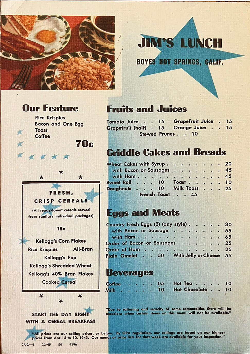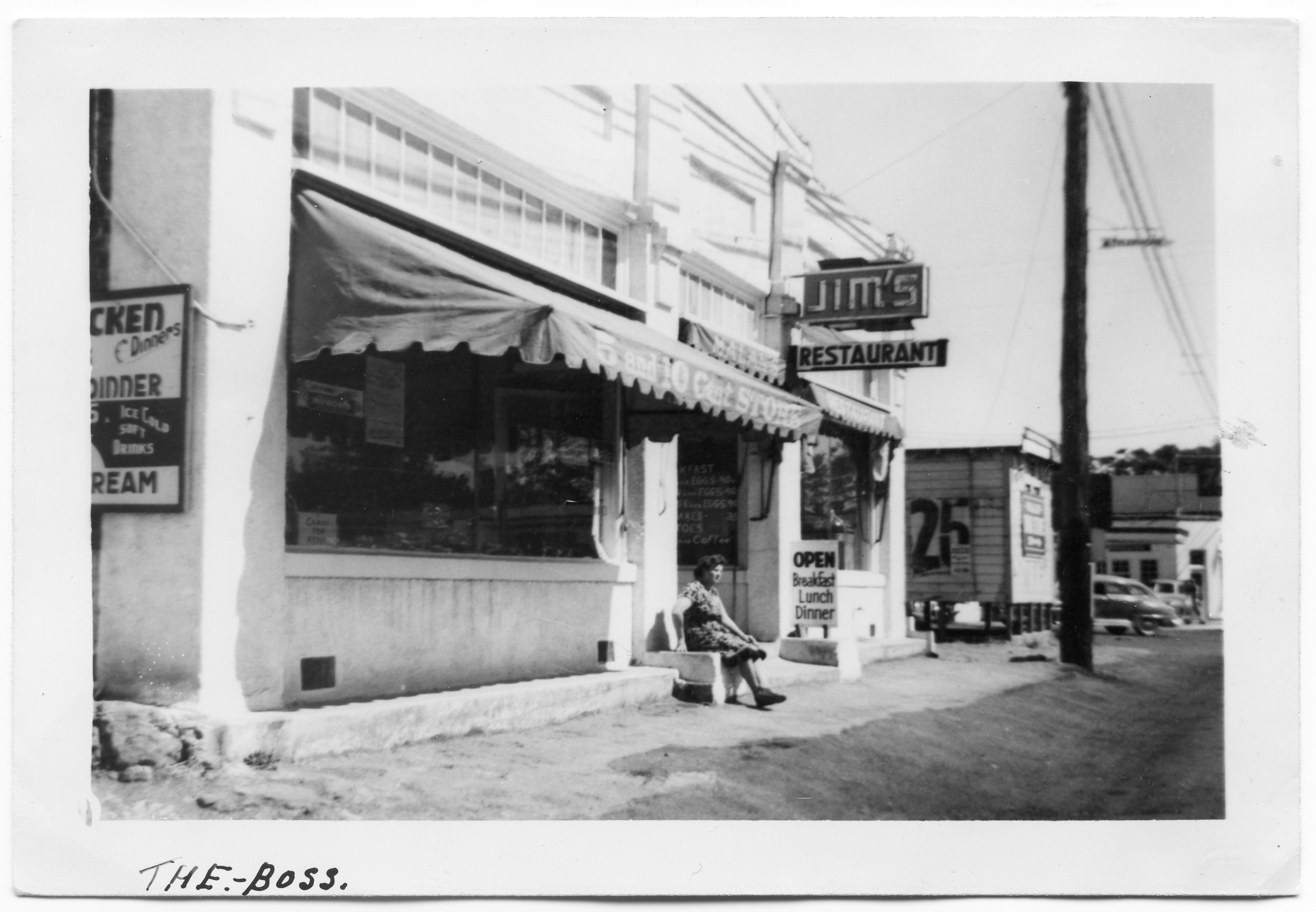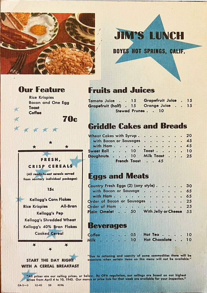Jim Nichols opened his Jim’s Lunch restaurant on Napa St. in Sonoma, “at the entrance of the ball park,” in 1933. In 1937 Jim sold to Marie Tarrens and moved to Oregon. But, in 1938, “Jim Nicholas, who sold out and left Sonoma for Oregon, only to return convinced that there is no place like the Valley of the Moon, is opening up a coffee shop and café at Boyes Springs in the Bob Liaros building. In 1939, Evelyn Frank and Alice Jones applied for a liquor license under the name of Jim’s Lucnh Room. Not sure where Frank and Jones went but in 1941 Alice Norrbom bought the establishment from Katherine Ewert Jorgensen. I believe the two photographs of Jim’s date from Mrs. Norrbom’s ownership. In 1944 she sold to Mr. and Mrs. Lloyd Reynolds and I think they were the last owners of Jim’s.