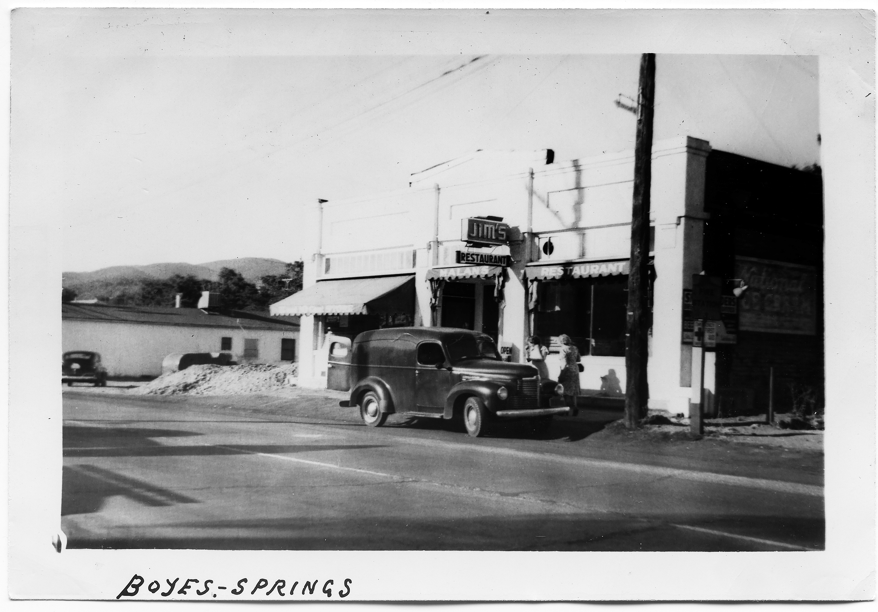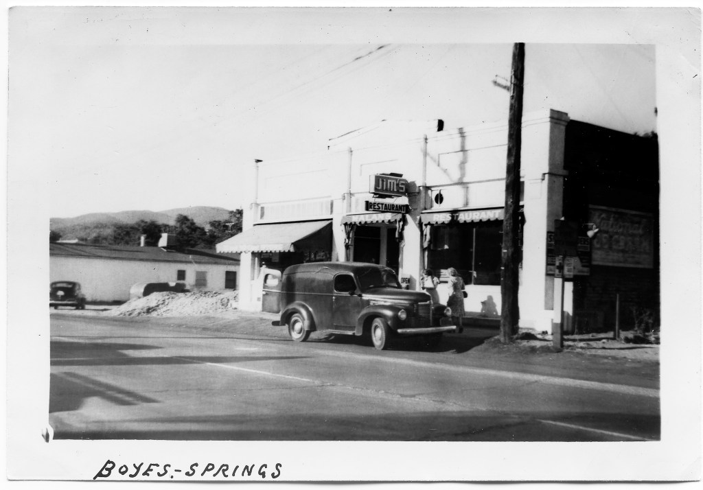 According to the Index Tribune, “Bob Liaros owns one of the finest and most substantial buildings on the highway in Boyes Springs. After the fire, Mr. Liaros took the slogan, “a bigger and better Boyes Springs” at its full value and proceeded to show that he, for one, meant to build bigger and better than before. In place of the frame building and barber shop which was located next to the original post office at Boyes, the enterprising business man let the contract for a handsome hollow tile type building, with concrete floors and fireproof throughout. The exterior is most attractive with its tile trim and plate glass front. The building is divided into two stores, in one of which Mr. Liaros has his beautifully appointed barber shop with its mirrors, three chairs and finest plumbing. He does bobbing for the ladies and has a competent assistant barber. Liaros has leased the store and living rooms in his building for an ice cream parlor and refreshment stand.” IT 1925.
