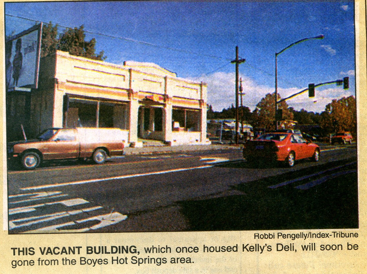 In the 1950s the Liaros building housed the Boyes Variety Store and Polidori’s store. Kelly’s Deli was there in the 1980s’90s. The building was torn down in 1992. The site now houses the Sonoma Mission Inn employee parking lot, alas.