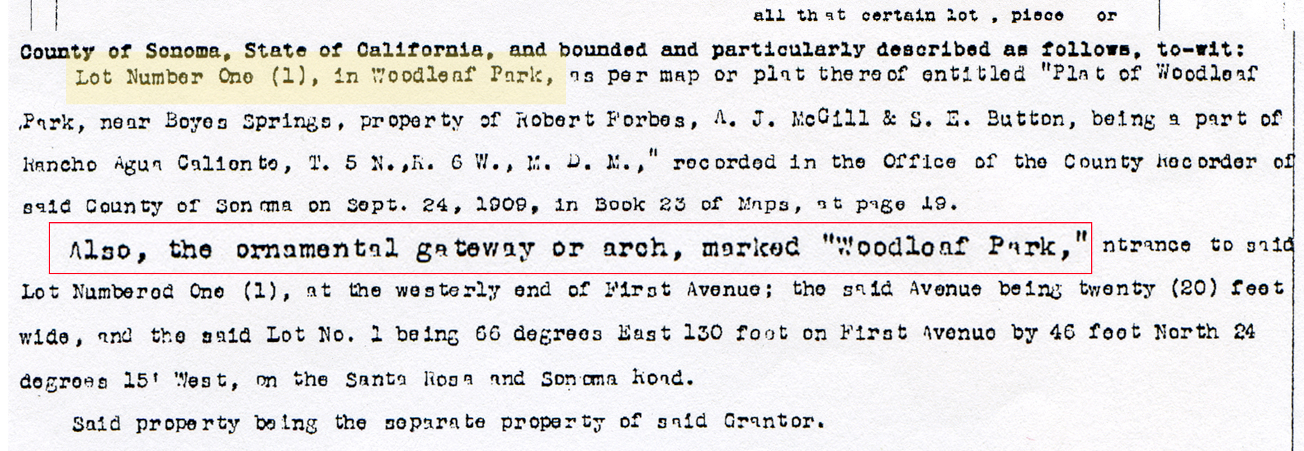 In 1931 Bob Liaros bought “Lot Number 1, Woodleaf Park, being a part of Rancho Agua Caliente, T. 5 N., R. 6 W, M.D.M.,” (The letter-number combinations are Township and Range. MDM stands for Mount Diablo Meridian, a baseline used by the Public Land Survey System.)