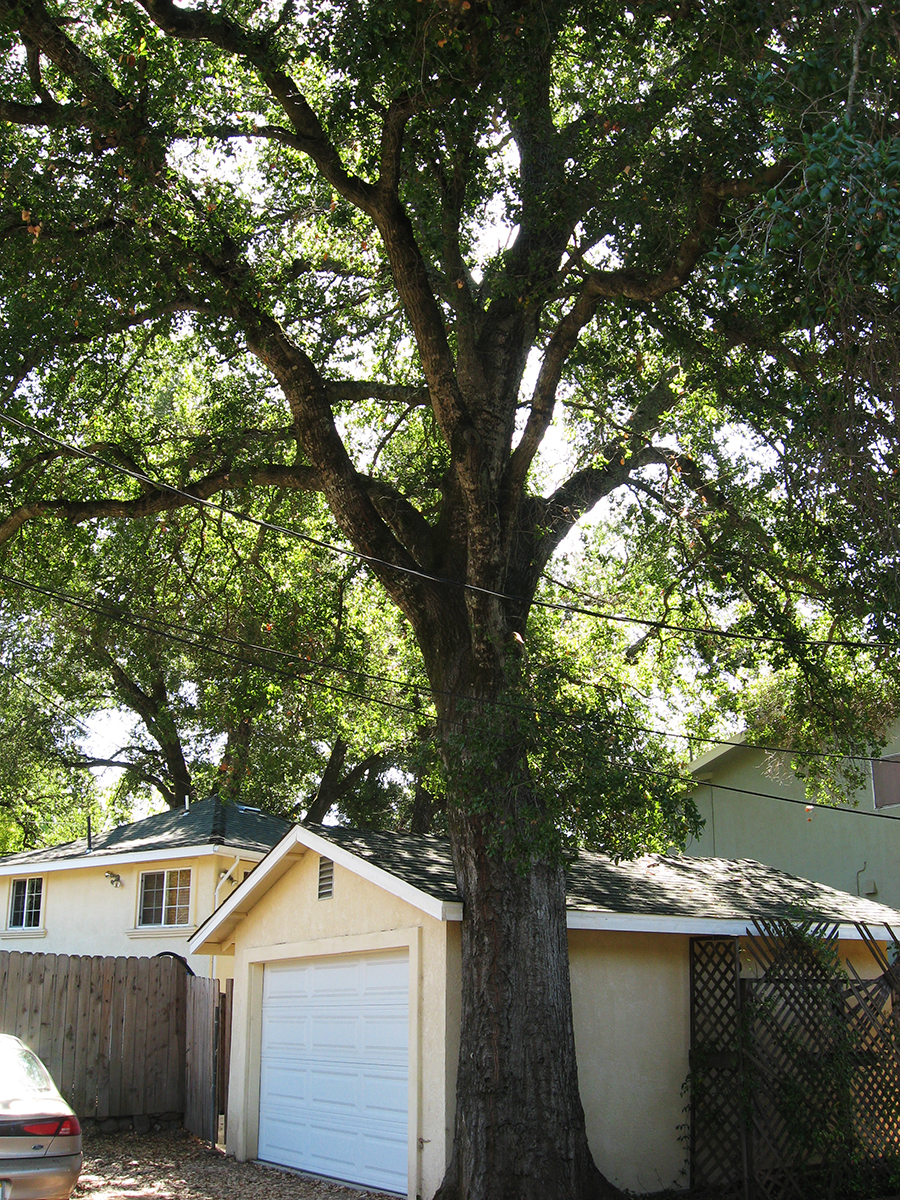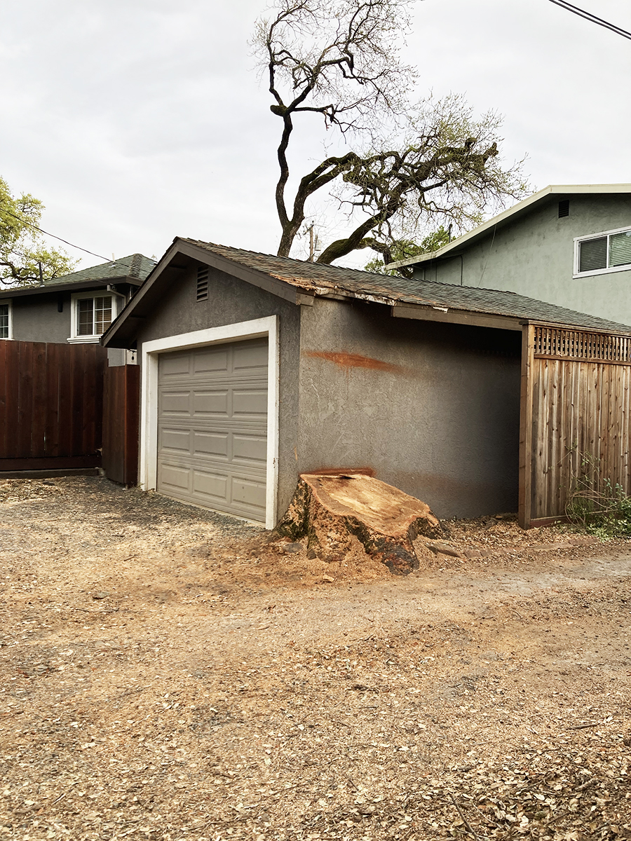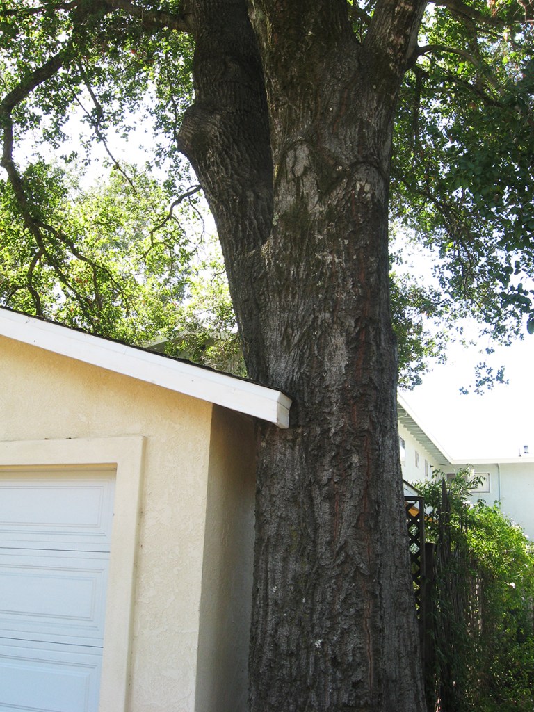 On Vallejo Ave. near the corner of Calle del Monte, in Boyes Hot Springs, there stood a prime example of the ongoing interaction between trees and the built environment: A garage was built next to an oak, the oak grew, humans adapted the structure to accommodate the native tree. This was a lovely thing to see.