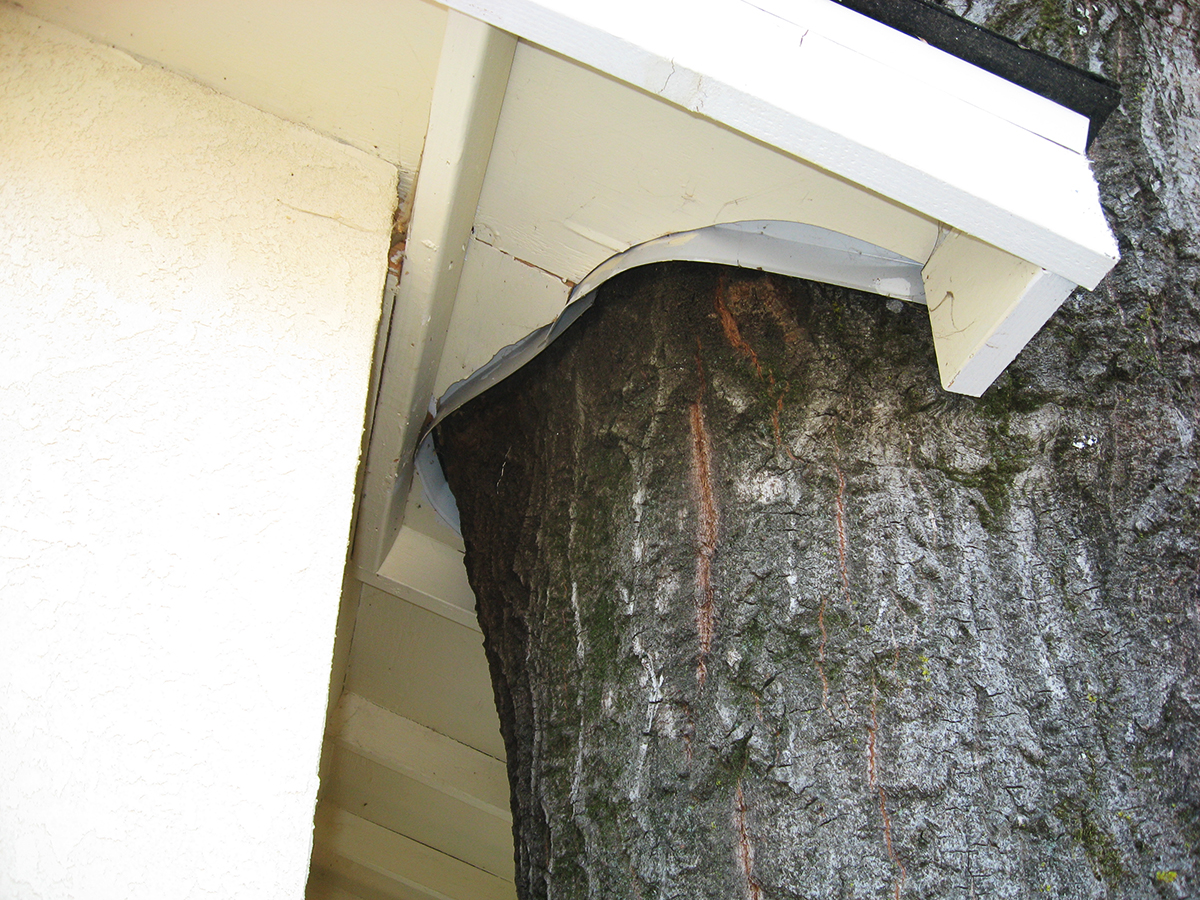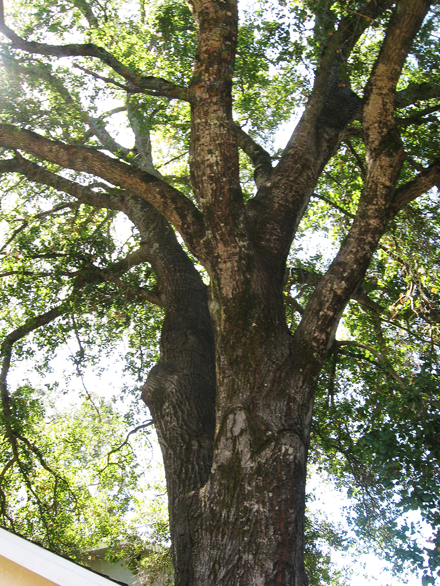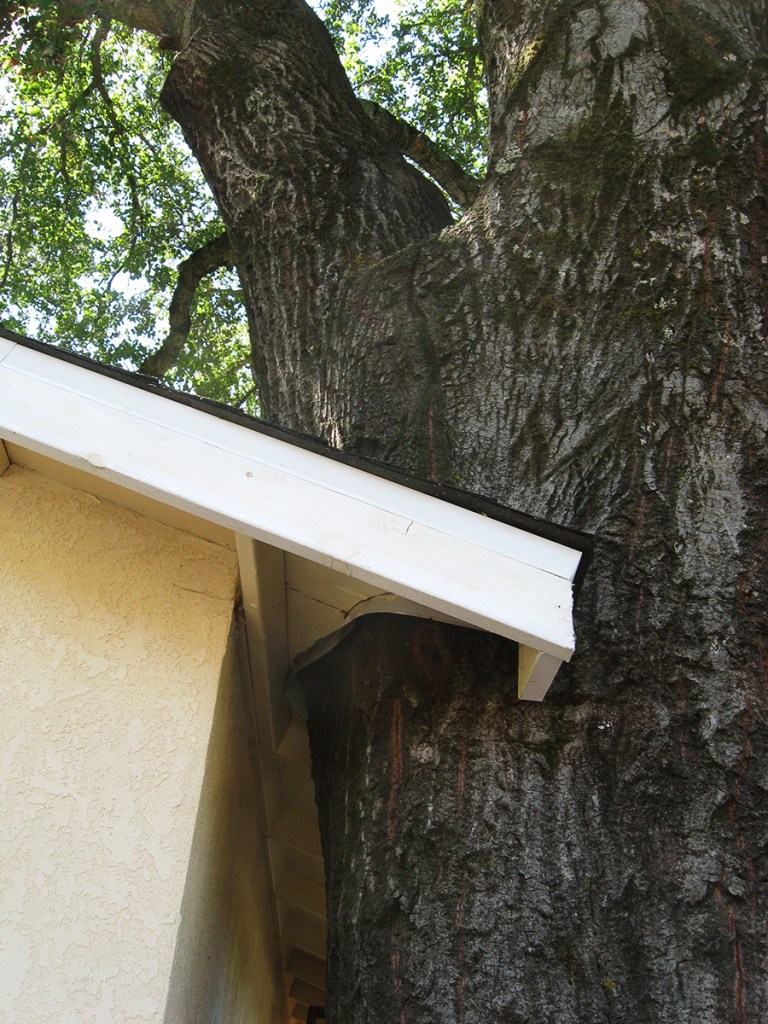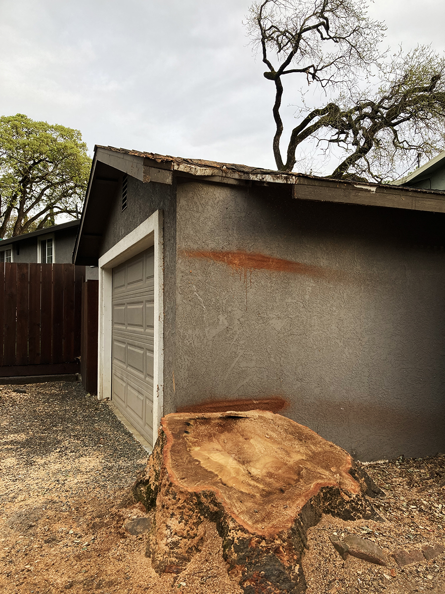 On Vallejo Ave. near the corner of Calle del Monte, in Boyes Hot Springs, there stood a prime example of the ongoing interaction between trees and the built environment: A garage was built next to an oak, the oak grew, humans adapted the structure to accommodate the native tree. This was a lovely thing to see.