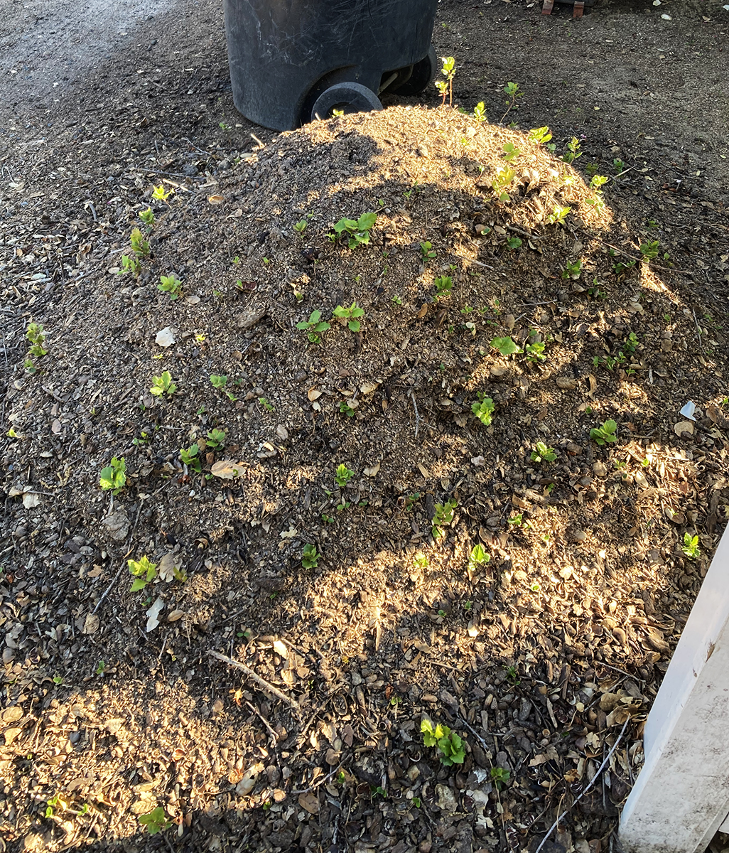 Below are photos of a mound of earth and wood chips next to the stump. It is absolutely covered in oak seedlings. Nature continues!