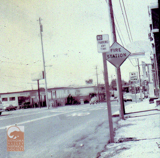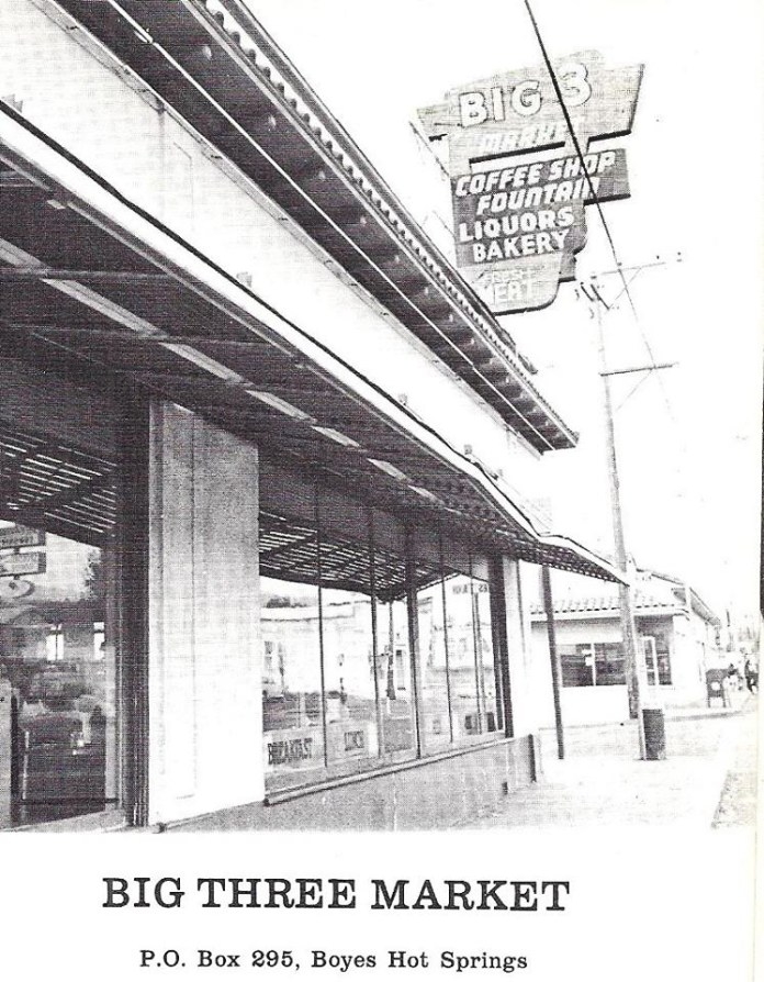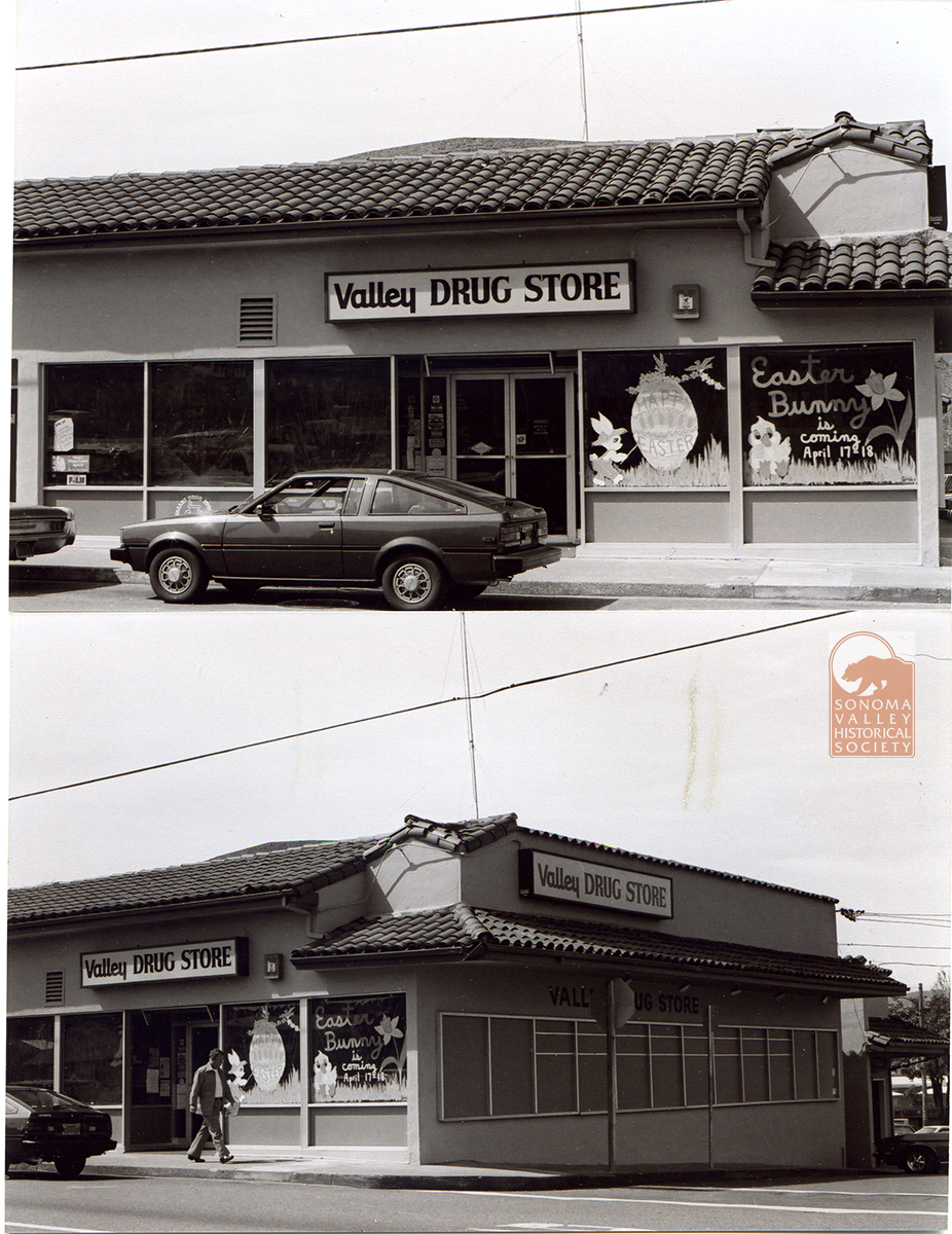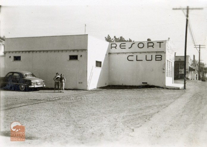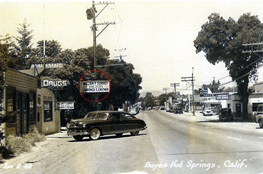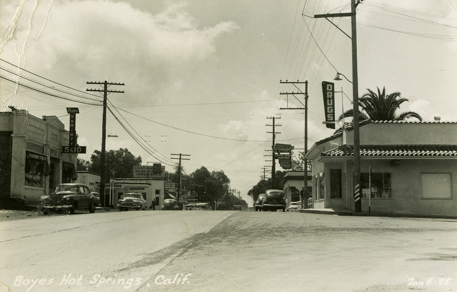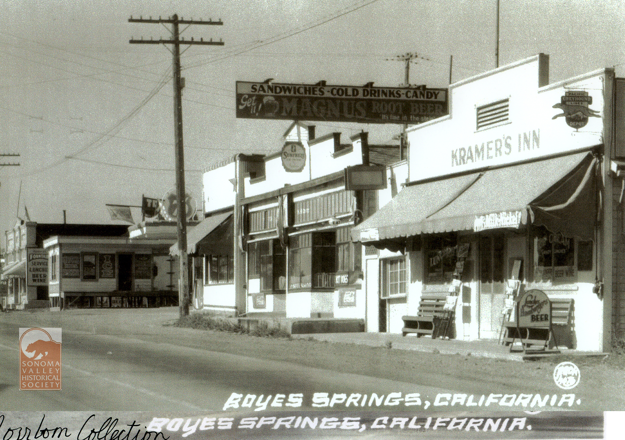 Commercial buildings on either side of the eastern part of Boyes Blvd. 1930s. The Kramer’S Inn building is seen in the next two photos, from 2008 and 2025.Circa 20082025The Gallo brothers ran a service station and car dealership from 1949 into the 1970s. The building, immediately south of Kramer’s, is now Golden West Glass.Southwest corner of Boyes Blvd. and Highway 12, 1980s. The Big Three, as it was then known. Now part of the Sonoma Mission Inn, but no longer a public building.Earlier, taller version of the sign.The wonderful Woodleaf sign, upper right. Zan Stark photo.1950s. Before it was the Big Three, the building was the Woodleaf Store. At left is the building that had previously held Jim’s Cafe. More in Part 2. The palm tree peeking over the rooftop at right is situated in Boyes Springs Plaza, as once was. Pine Wagner’s Valley Drug was in the building at right center. Pine Wagner was perhaps the first woman to be a licensed pharmacist in California. She operated her store from 1946 until 1962. Zan Stark photo.Pine Wagner’s first location, on the highway, in Bud Castner’s building, opposite Arroyo Road. Zan Stark photo.Easter! 1970s? This commercial space was later the Church Mouse Thrift Store. Currently empty, alas.1960s. Looking north at the Boyes/Highway 12 intersection can be seen, far upper right, the Melody Club sign.Later, the old Lanning’s Resort Club/Melody Club became the offices of Lanning Construction.The Resort Club, 1951. pictured are Carla Robinson (L), and Helen Lanning (R). Photo courtesy of Lorrie Baetge Fuller, who is Carla Robinson’s daughter.The Melody Club sign circa 2009.