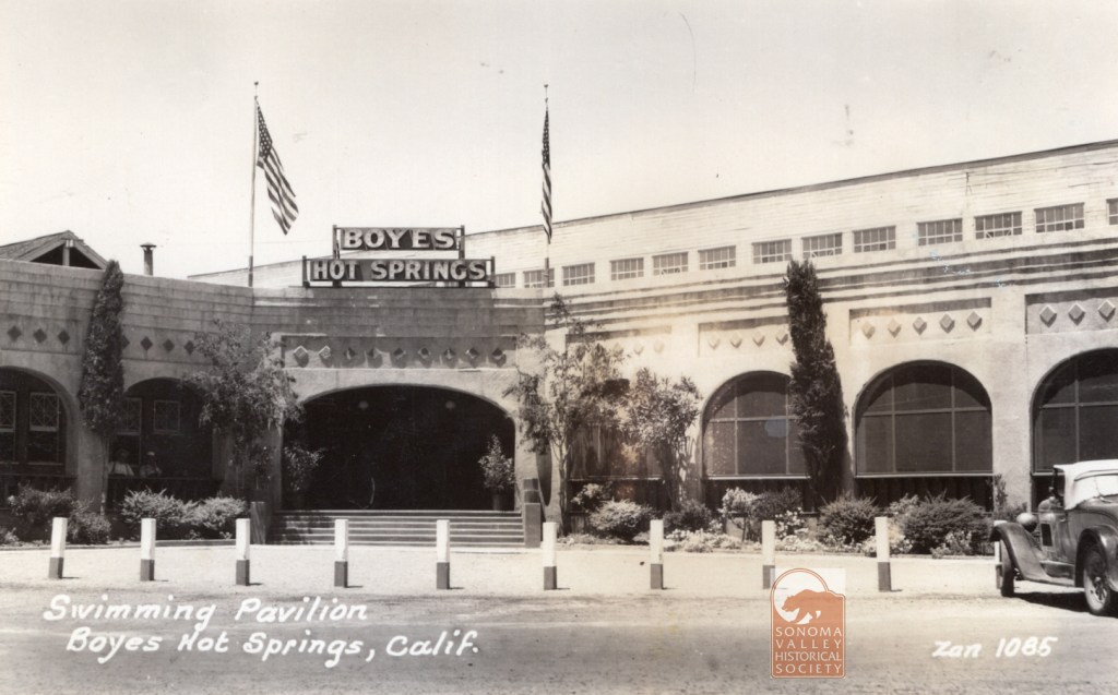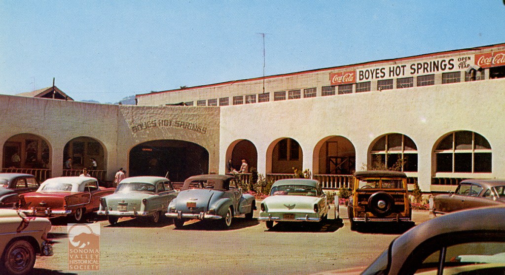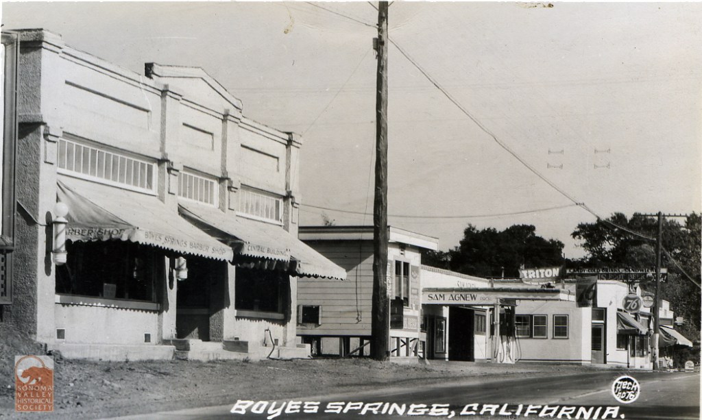 The corner of Boyes Blvd. and Highway 12, known then as the Santa Rosa road, 1930s. Sonoma Mission Inn sign at left mounted on a lattice-work in the Boyes Plaza. the palm tree was in the center of the plaza. Richfield gas station sign beyond that. On the right, Jim’s Cafe “Short Orders!” The building was built after the 1923 fire of ceramic brick, by Bob Liaros, a local barber. It stood until the early 1990s.