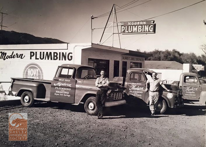 Modern Plumbing was founded in Boyes Hot Springs by Ted Riboni and Ed Feranndo in the 1950s. The building still stands, on the west side of the highway, opposite Bernhard Ave.
