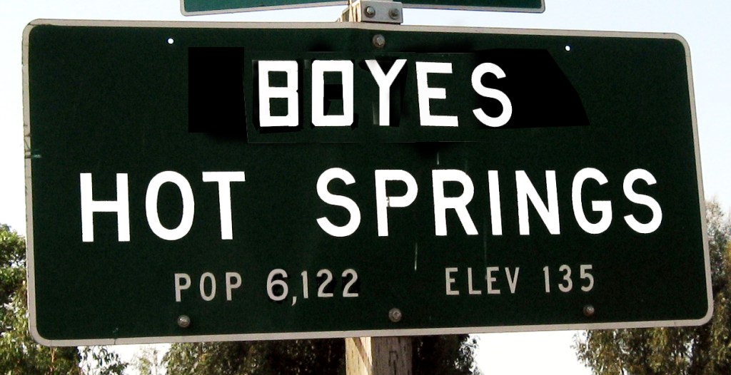 Both Agua Caliente and Fetters Hot Springs, just up the road, have official Caltrans place-name signs, but Boyes Hot Springs does not. Why? Who knows. The one above is my creation.