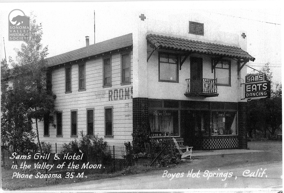 The corner of Boyes Blvd. and Highway 12, known then as the Santa Rosa road, 1930s. Sonoma Mission Inn sign at left mounted on a lattice-work in the Boyes Plaza. the palm tree was in the center of the plaza. Richfield gas station sign beyond that. On the right, Jim’s Cafe “Short Orders!” The building was built after the 1923 fire of ceramic brick, by Bob Liaros, a local barber. It stood until the early 1990s.