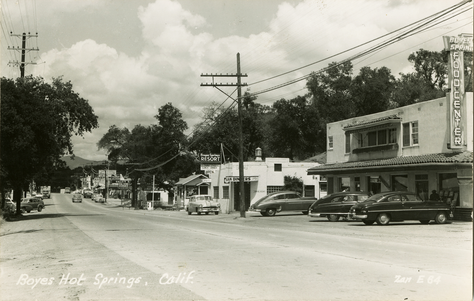 1949, looking north on the highway. Beyond the Food Center is the Boyes Springs Resort, now a parking lot. Beyond that, the original Mary’s Pizza.