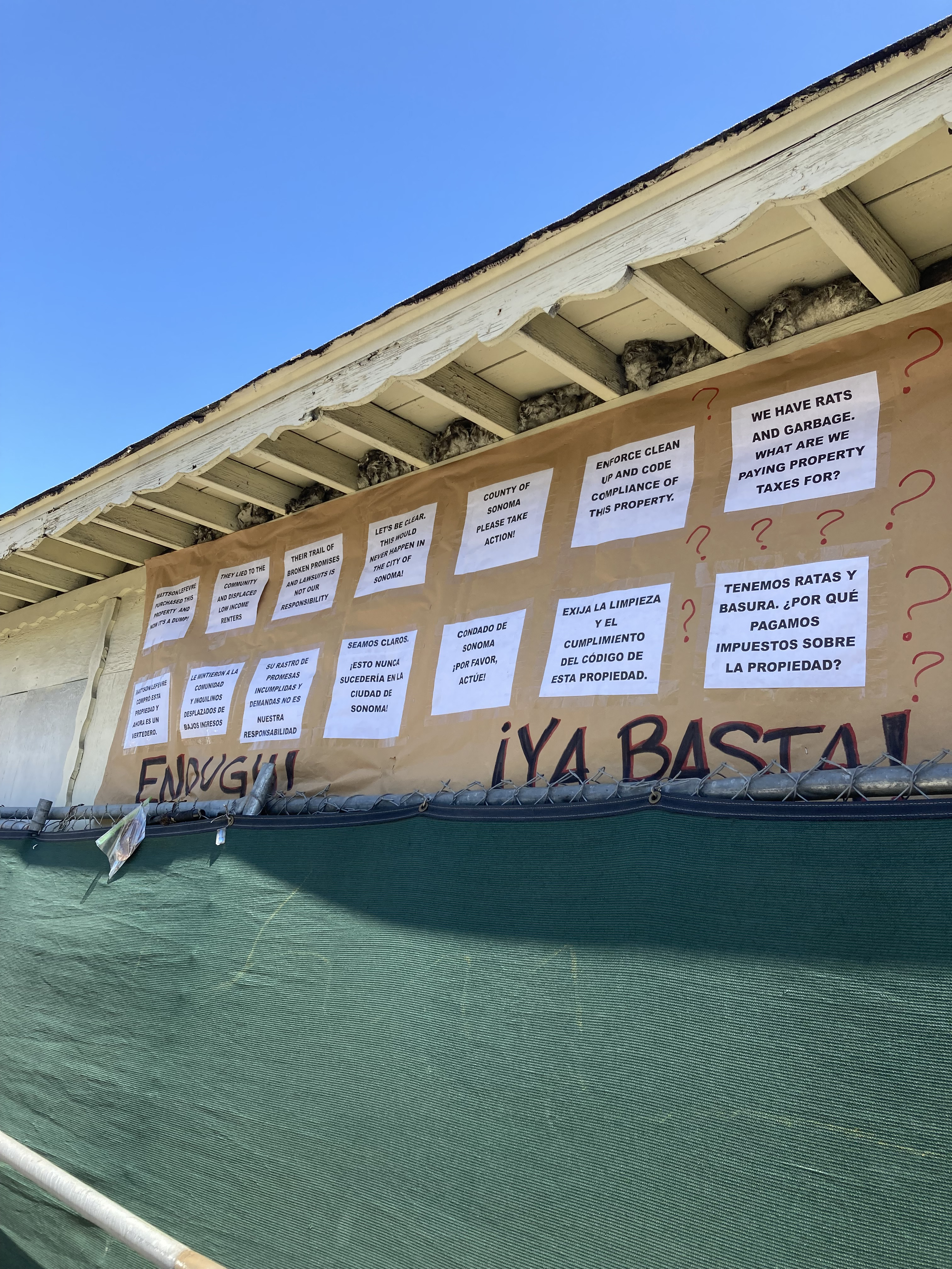 Flash forward to 2025. The unfortunate deterioration of the property continues. Neighbors are concerned enough to put up this sign on the front of the original shack. The current owner is under suspicion of fraud. We await remediation, but the wheels of County agencies turn slowly.