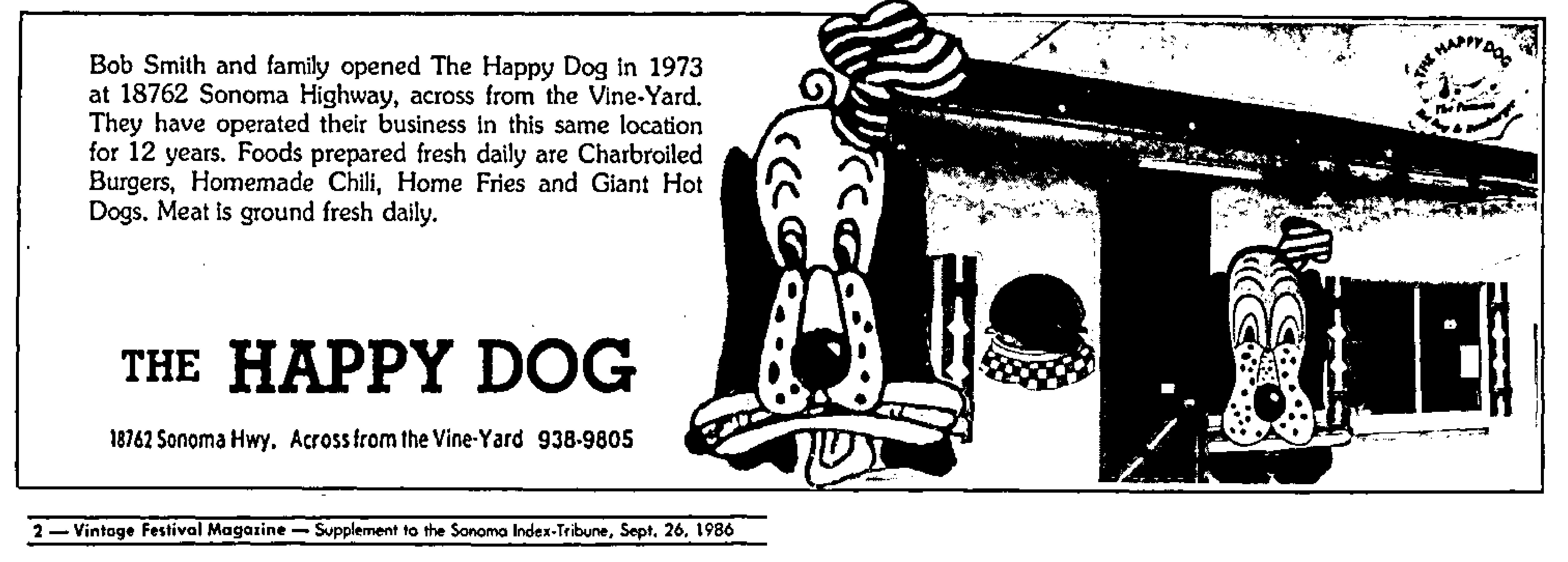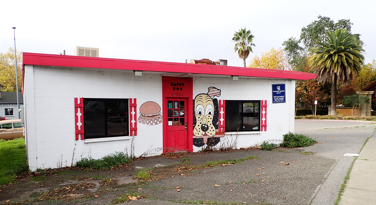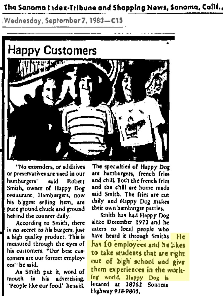 Robert Smith, a native of Canada, veteran of WWII in the Pacific, and former Real Estate Broker, looking for a career change, founded the Happy Dog in 1973. It started out as a hotdog stand, but soon added hamburgers, which became famous in the Bay Area.  By 1984 they were selling 100,000 hamburgers per year. It’s fame caught the attention of the San Francisco Chronicle, which featured the restaurant in 2016 in a section they called “Cheap Thrills.” Generations of Sonoma Valley teenagers got their starts in the work-world at the Dog.