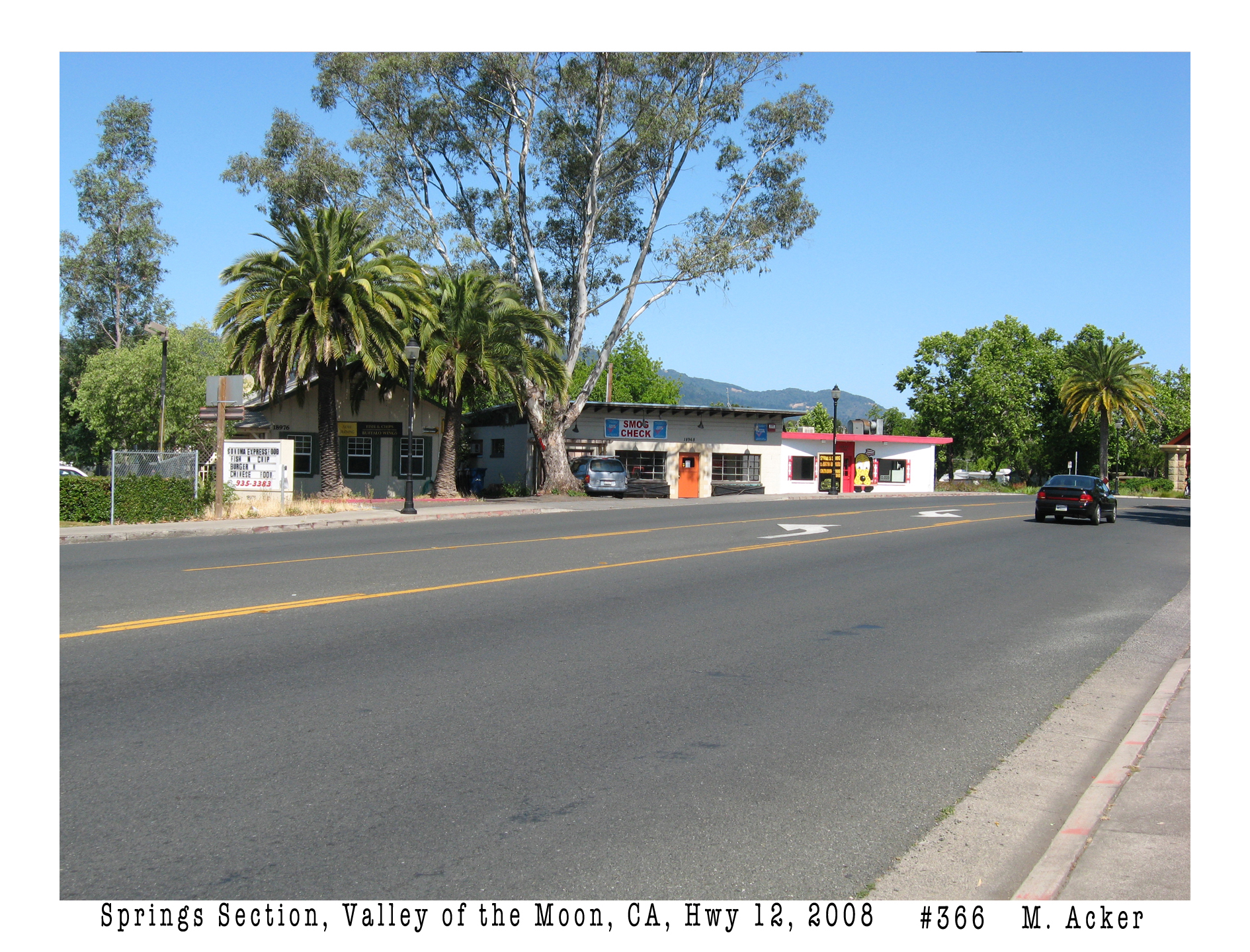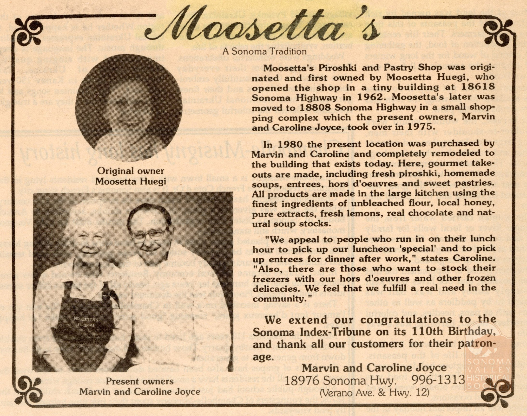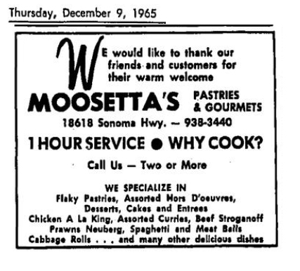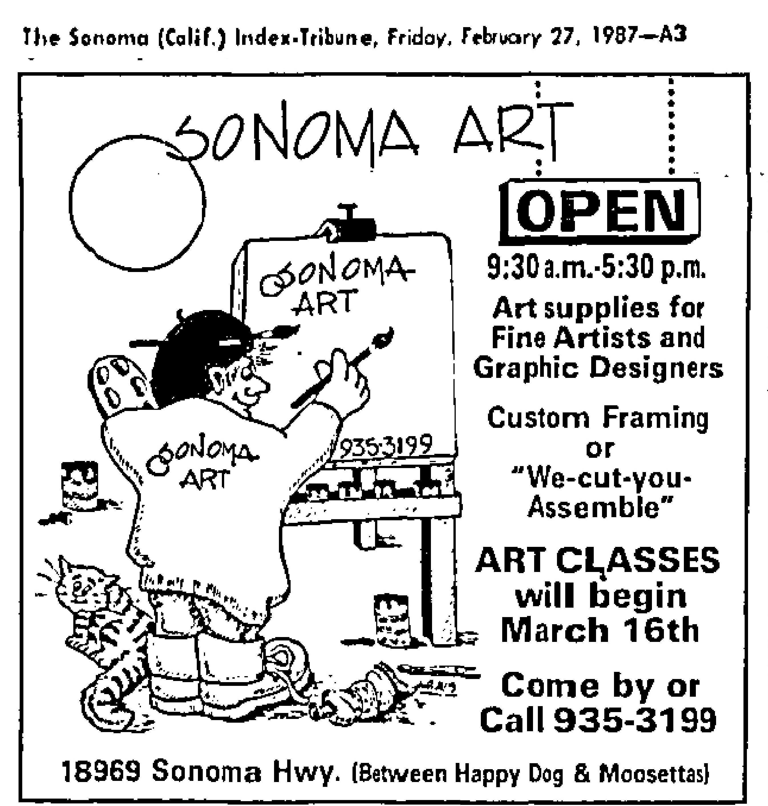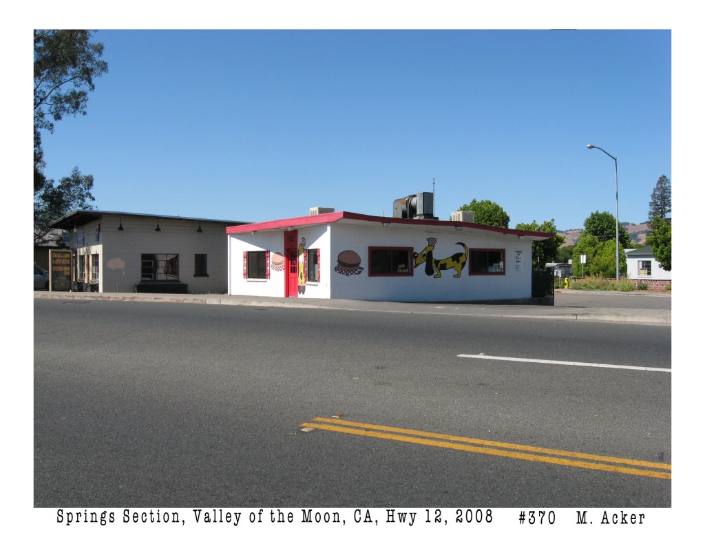 The concrete block building with the dog murals is one of three in close proximity to each other along Highway 12 in El Verano. In 1987, Terry and Bob Morris opened an art supply store in the building next door (now Steve’s Auto shop). The southern-most building (18976 Highway 12), closest to McDonalds, now the Verano Cafe, was once the home of Moosetta’s Piroshki and Pastry Shop, which opened in 1962 at a different location. The Art Store soon moved to 5th Street West.  Moosetta’s moved north to the small commercial center at 18808. That space was later the Rocket Café and is now Baker and Cook.