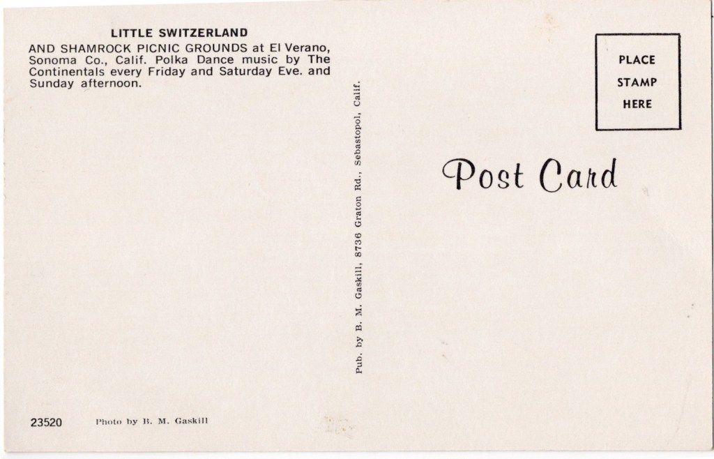 B.M. Gaskill was another commercial photographer working in Sonoma county in the mid-century. There are much better photos of Little Switzerland, but I’m interested to discover this photographer, and I’m in search of more of his images.
