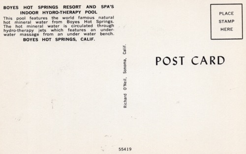 Richard O’Neil was a well-known commercial photographer in Sonoma, from the 1940s through the 1960s. He photographed many weddings, school portraits, and newspaper pieces. This weirdly green image is probably from the mid 1960s. More about the Bath House here.