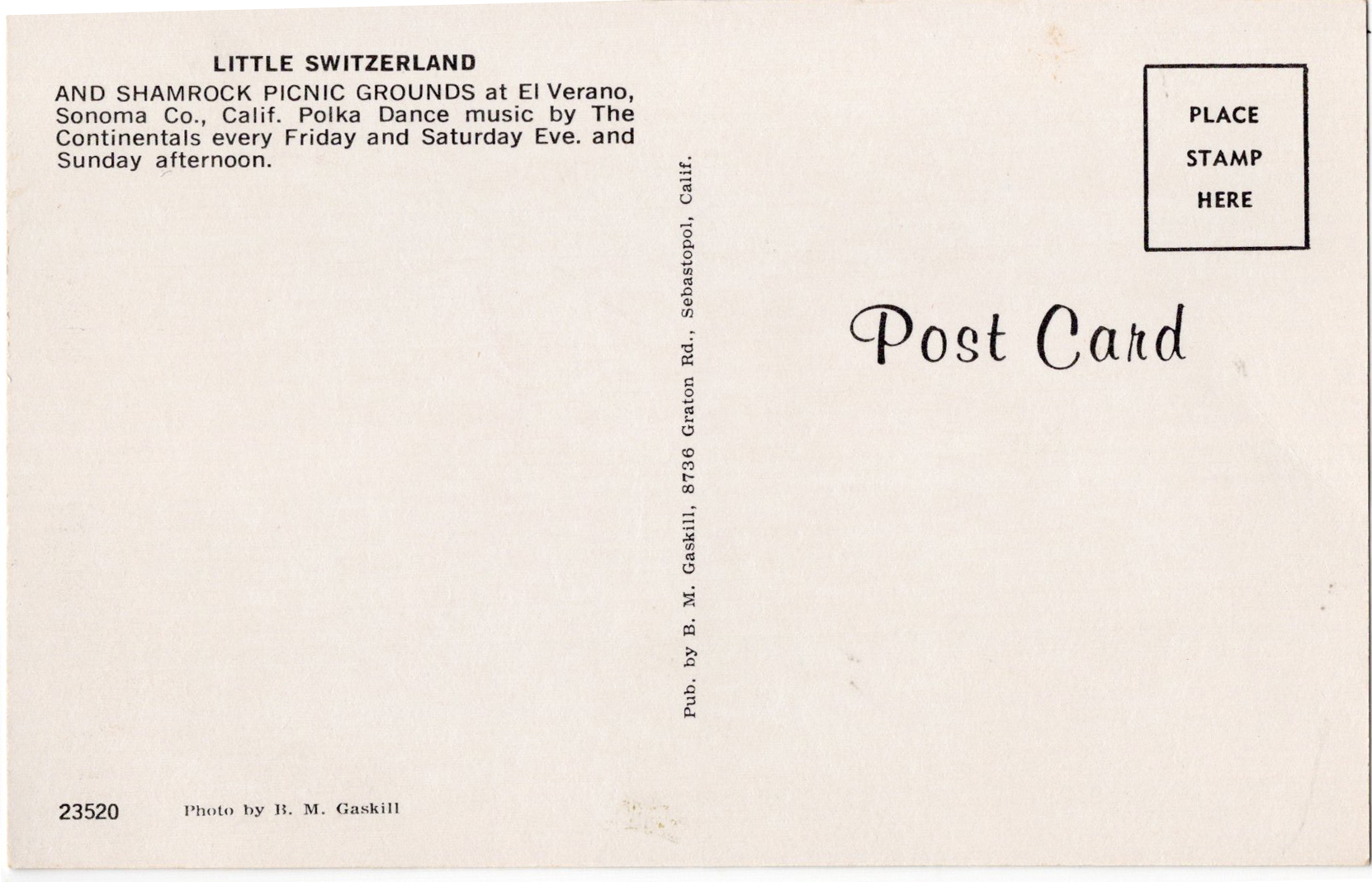 B.M. Gaskill was another commercial photographer working in Sonoma county in the mid-century. There are much better photos of Little Switzerland, but I’m interested to discover this photographer, and I’m in search of more of his images.