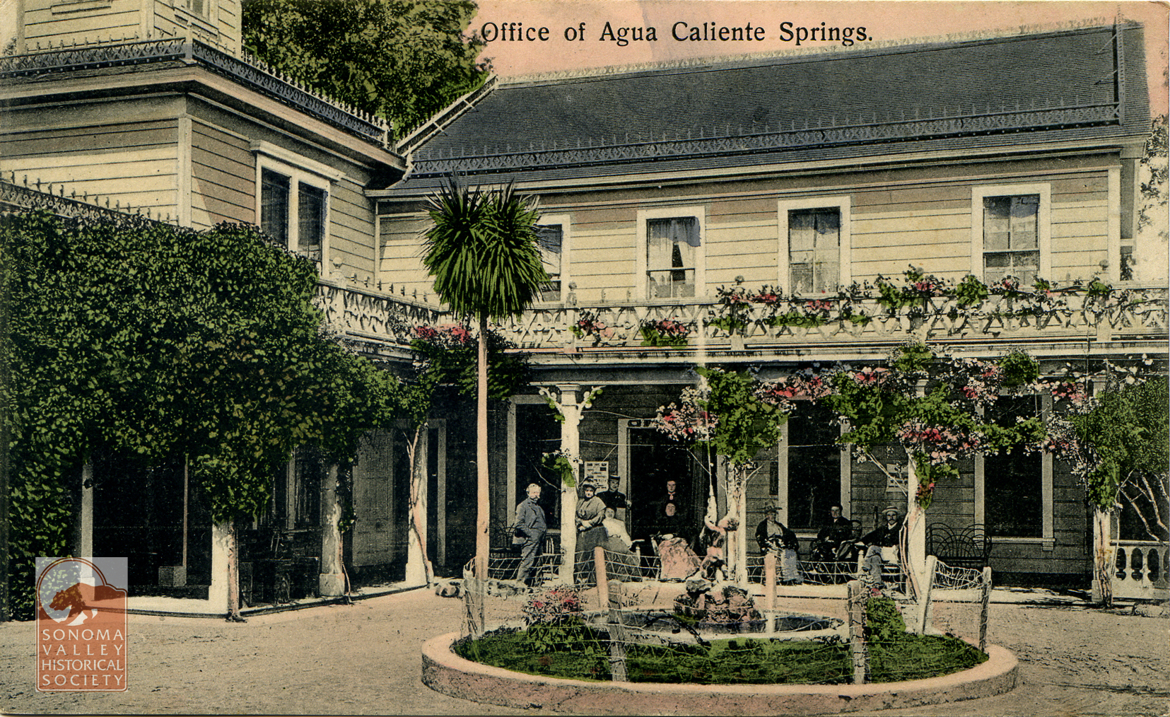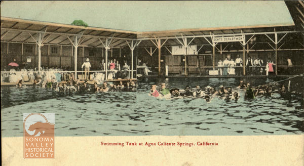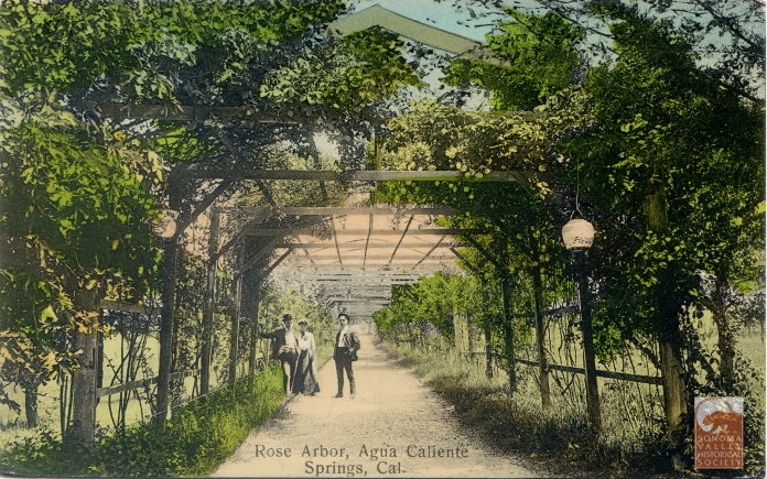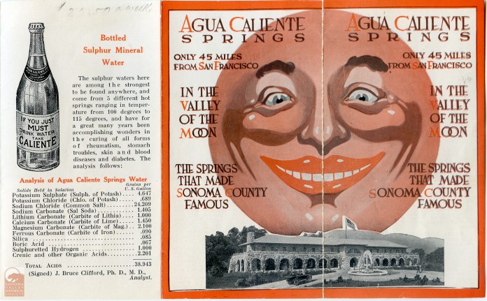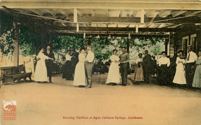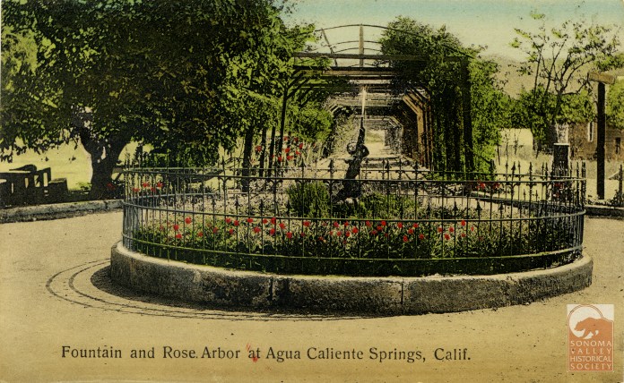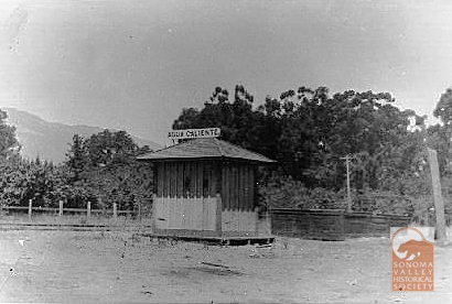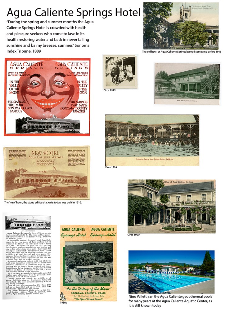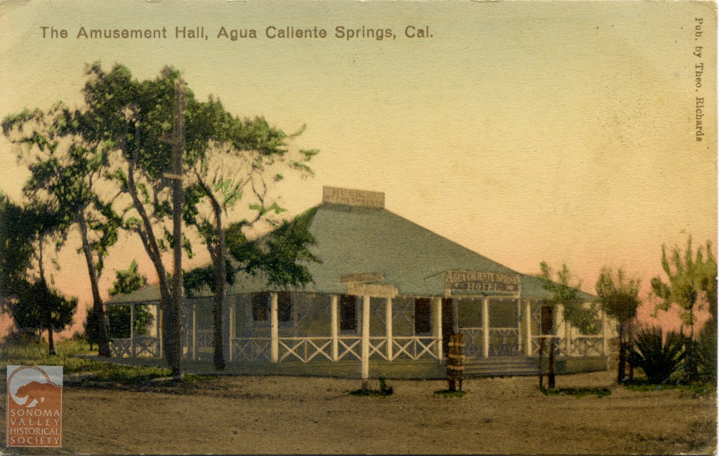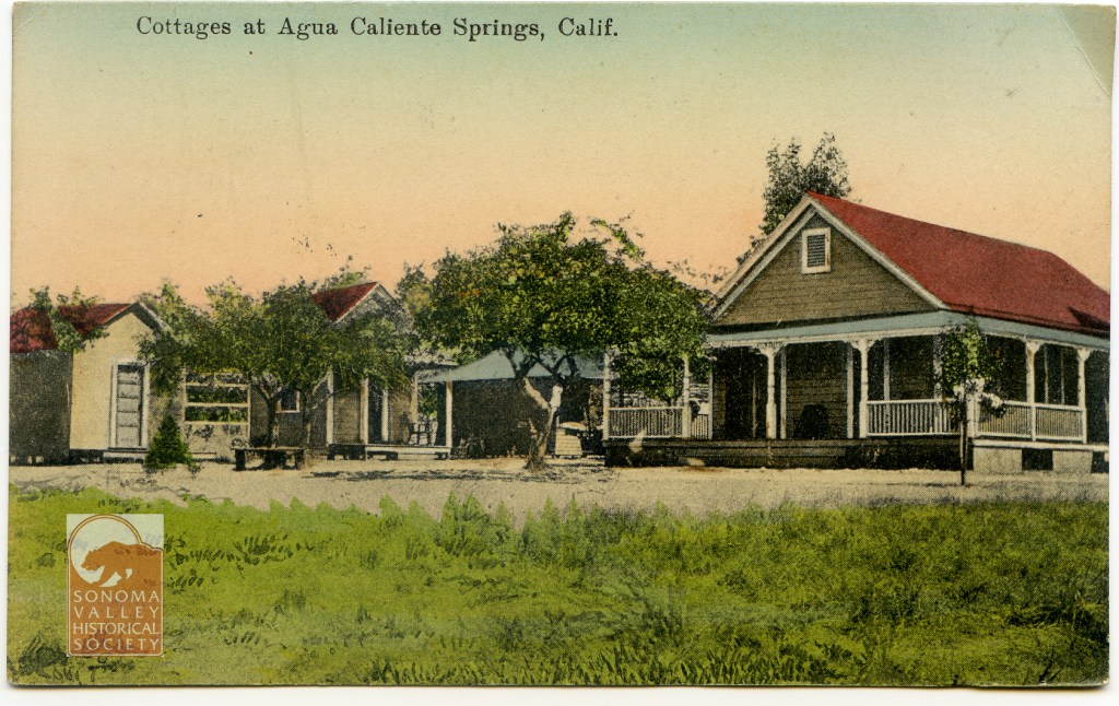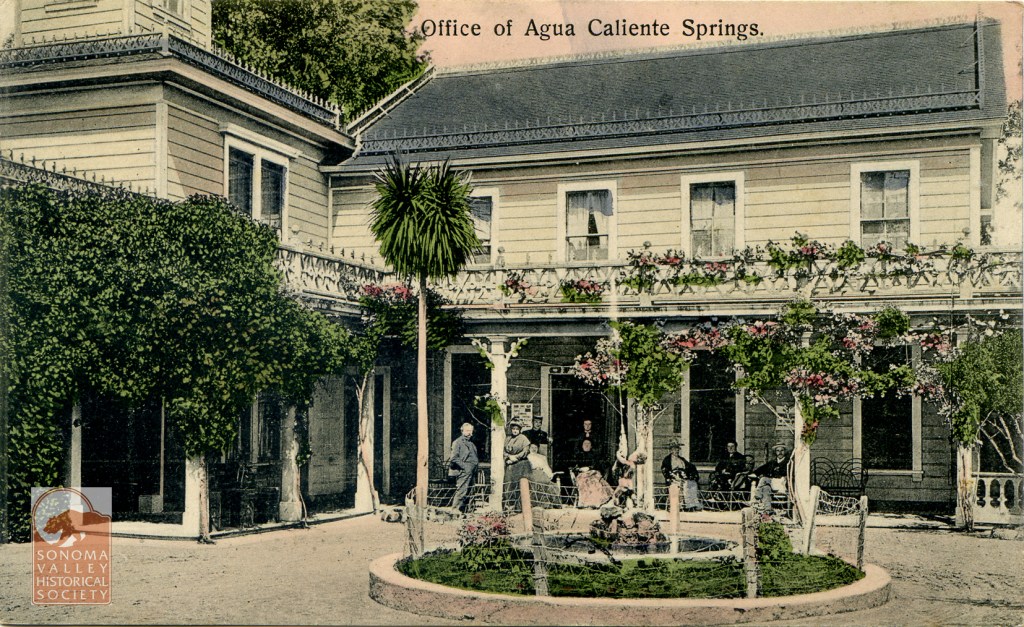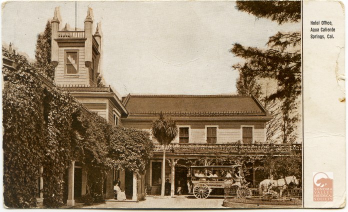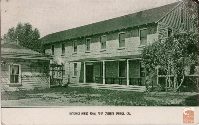 An puff piece in an 1889 issue of the Index Tribune read, in part, “the famous health-giving springs, delightful location and basalt block interests of this progressive little village is destined at no distant day to make it a place of considerable importance. The town was laid out a little over a year ago (incorrect!) by M.K. Cady, one of Sonoma Valley’s most energetic and public-spirited men. The railroad runs through the place which boasts of an express office, post office, schoolhouse, hotel general merchandising store, butcher shop, and a blacksmiths shop. During the spring and summer months the Agua Caliente Springs Hotel is crowded with health and pleasure seekers who come to lave in its health restoring water and bask in never failing sunshine and balmy breezes. An Episcopal Church will be erected a Agua Caliente this summer.”