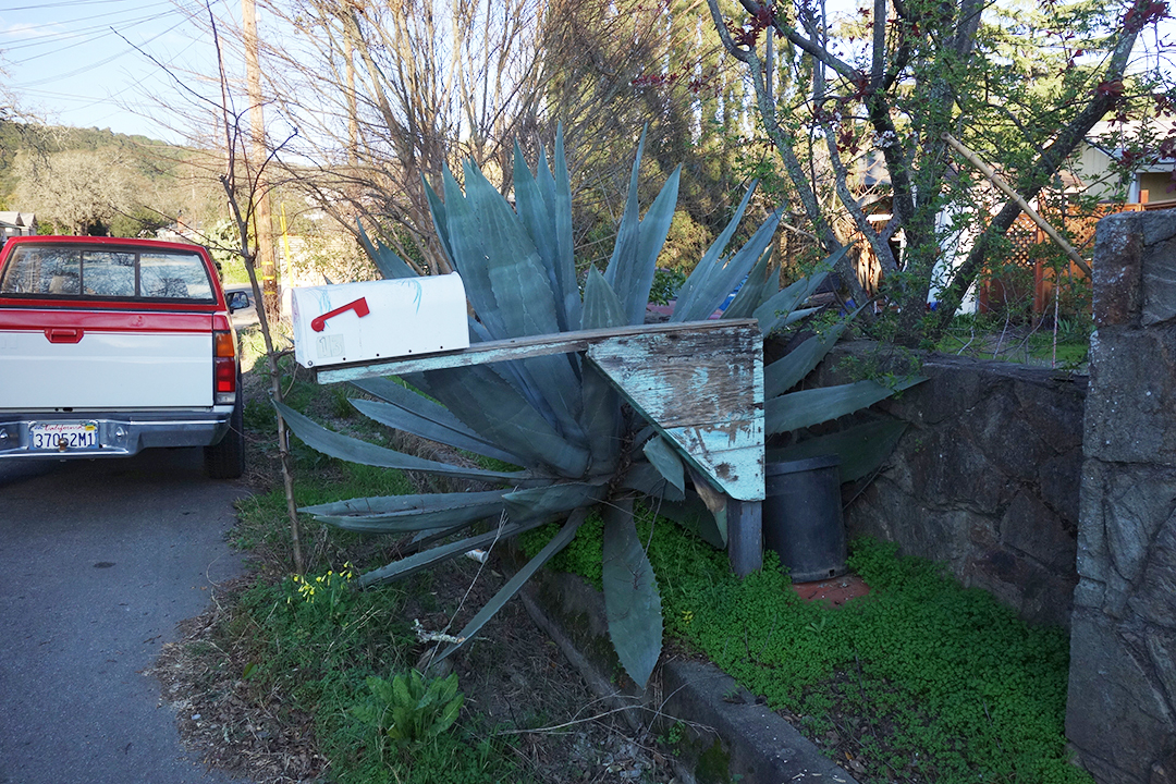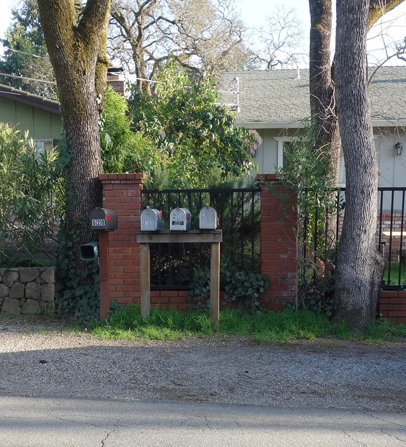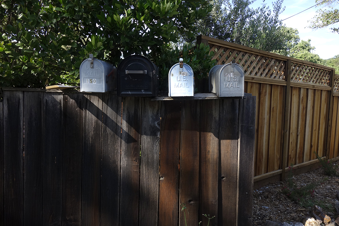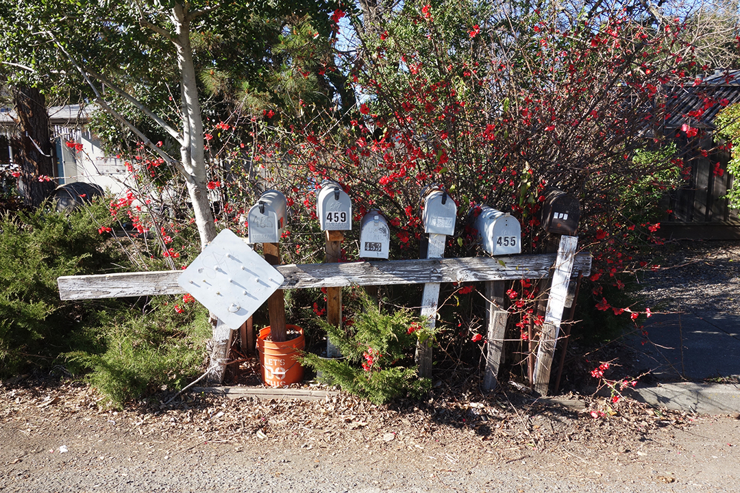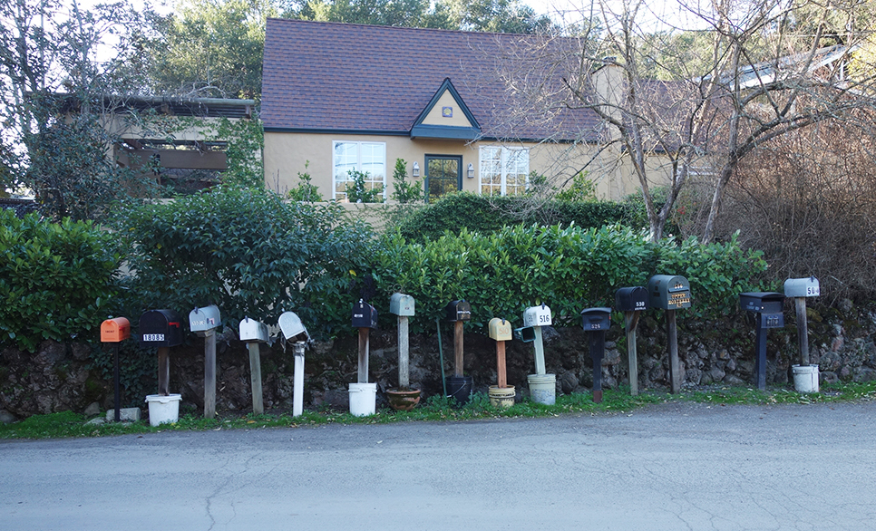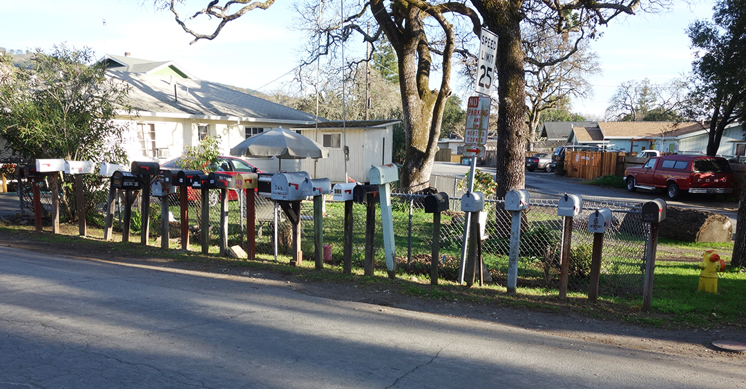 The United States Postal Service does not deliver mail to many houses in Boyes Hot Springs, Fetters Hot Springs, Agua Caliente, and El Verano, so people put mailboxes out on the street. Over time, these boxes, singly and in groups, take on personalities.