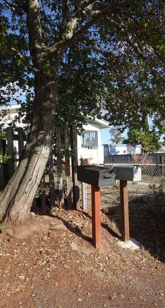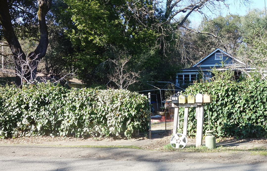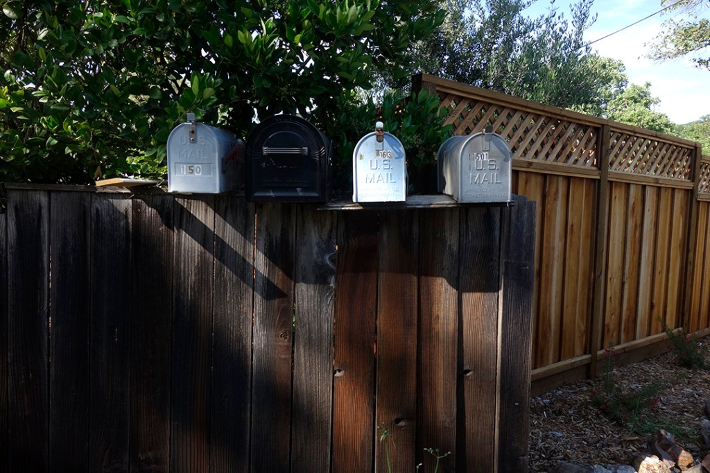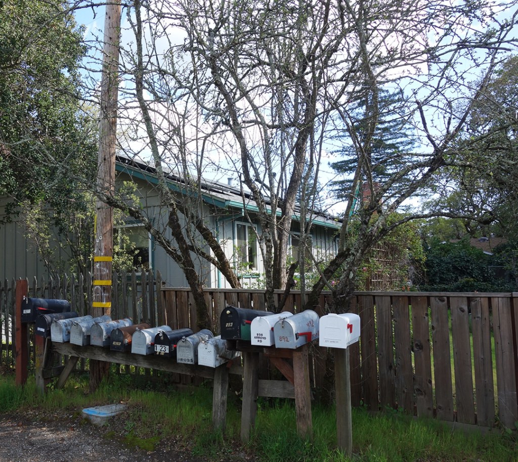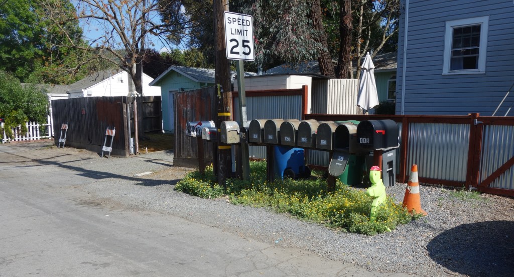 The United States Postal Service does not deliver mail to many houses in Boyes Hot Springs, Fetters Hot Springs, Agua Caliente, and El Verano, so people put mailboxes out on the street. Over time, these boxes, singly and in groups, take on personalities.