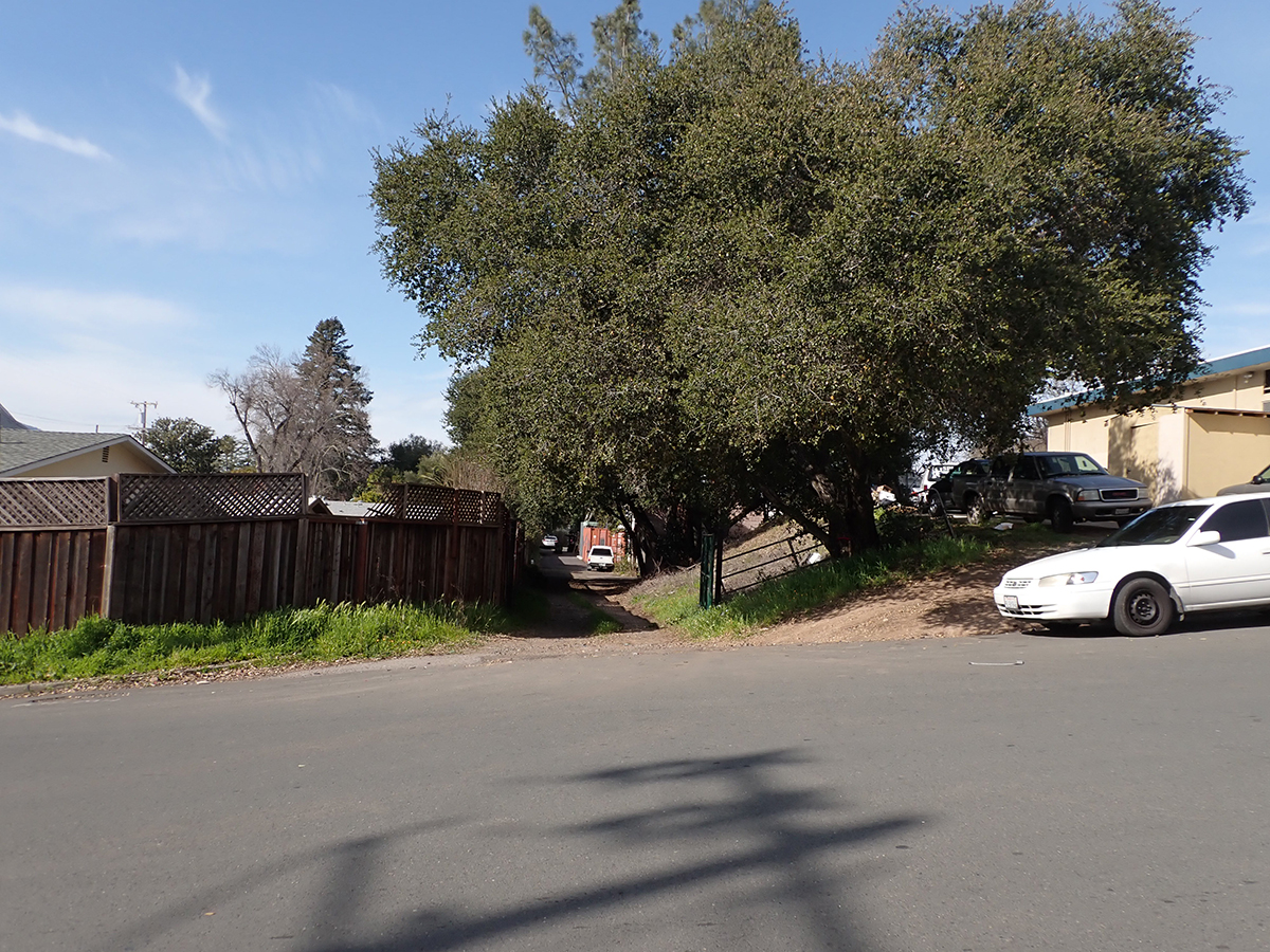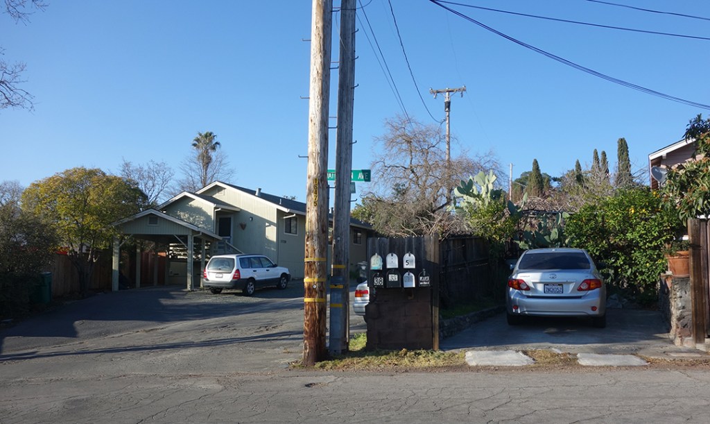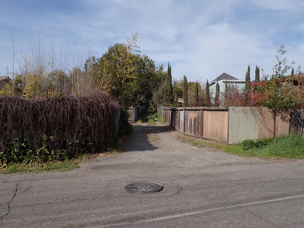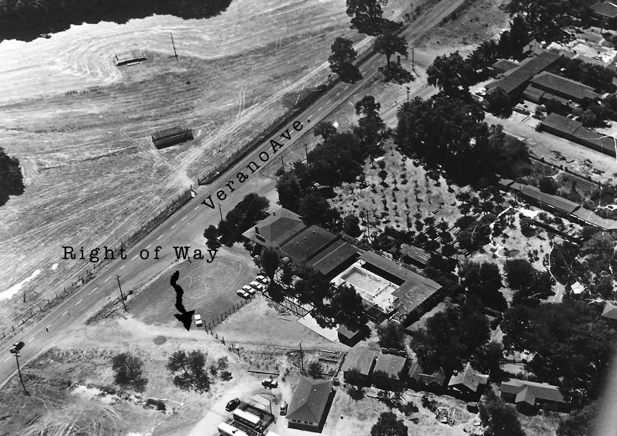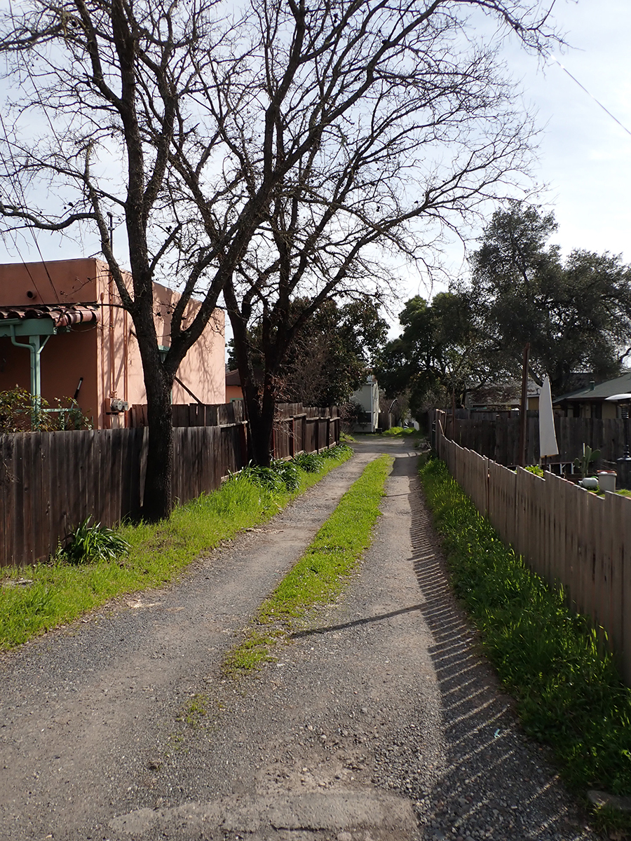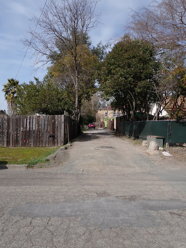 The next trace is the old Fetters Depot building on Depot Rd in front of Flowery School. It crosses the Fetters Apartments and Charter School properties and is seen again at Vialetti Dr. The old roadbed has become the alley the runs from Vailetti to Marin Ave. That is the last appearance of the right-of-way in the area.