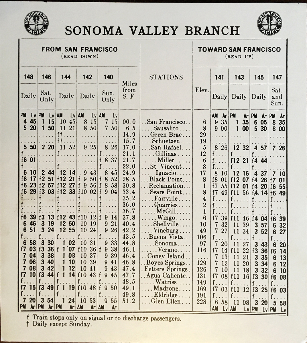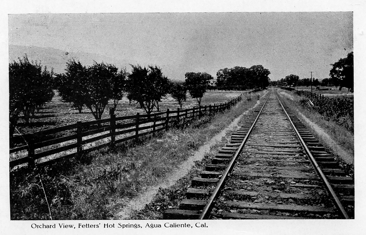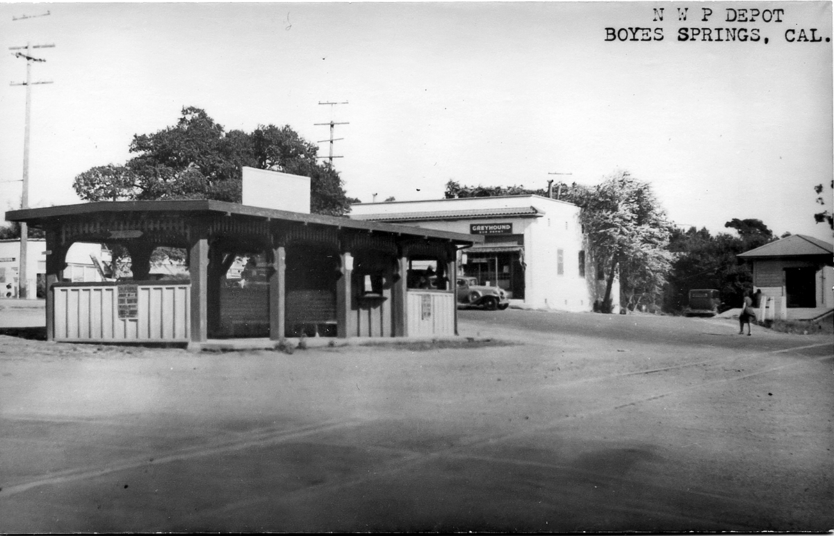 The last year of operation for the Northwest Pacific Railroad in Sonoma Valley, which ran on the east side of Sonoma Creek, was 1942. That year freight service ended, and the tracks were torn up for steel for the war effort. Traces of the right-of-way can be seen in several places in El Verano, Boyes Hot Springs, Fetters Hot Springs, and Agua Caliente.