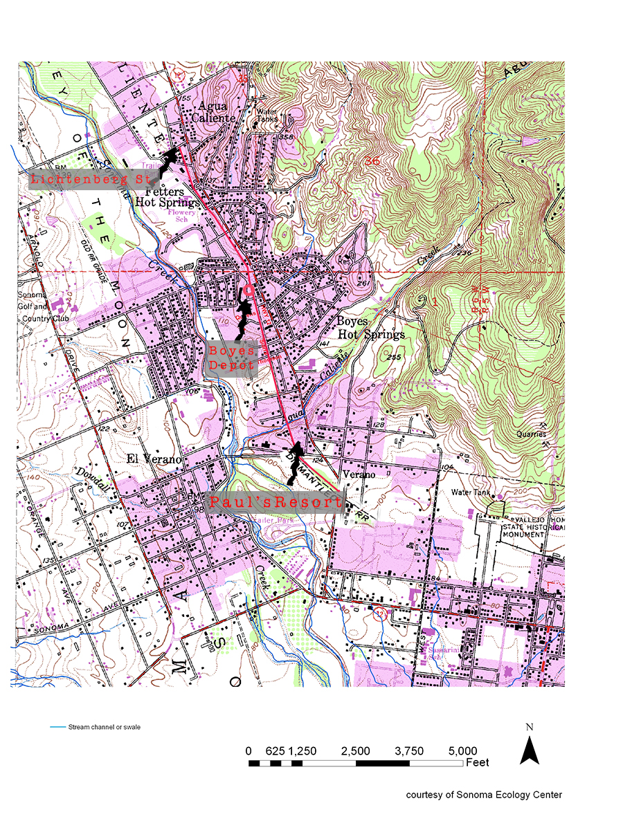 In El Verano the tracks run through the Paul’s Resort property, where the Verano (not El Verano) depot was located.