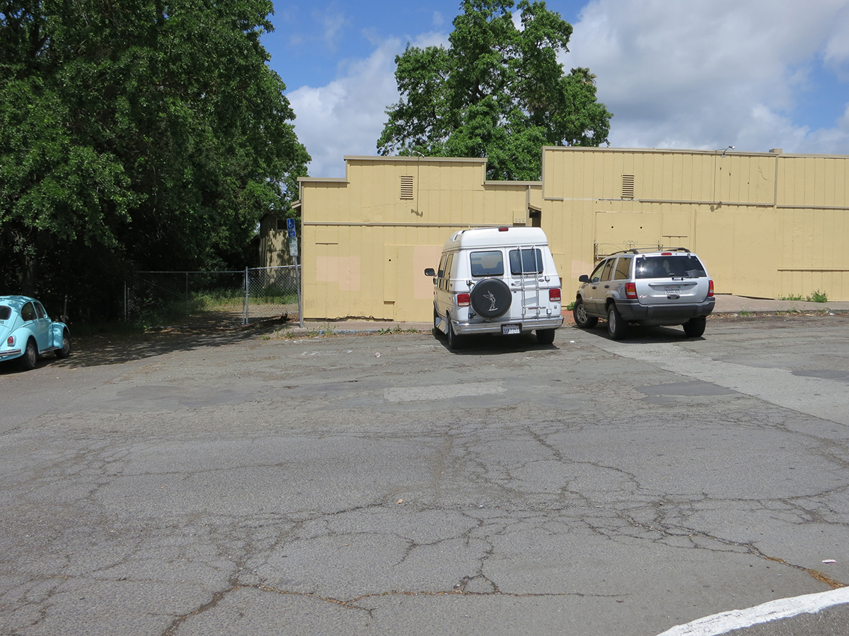 Right-of-way next to old commercial buildings at Boyes Plaza, which were demolished in 2018. Photo taken from the apporxiamte location of the Boyes Depot.
