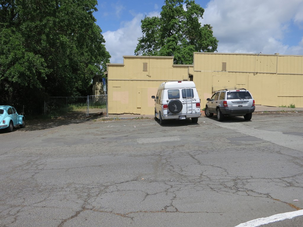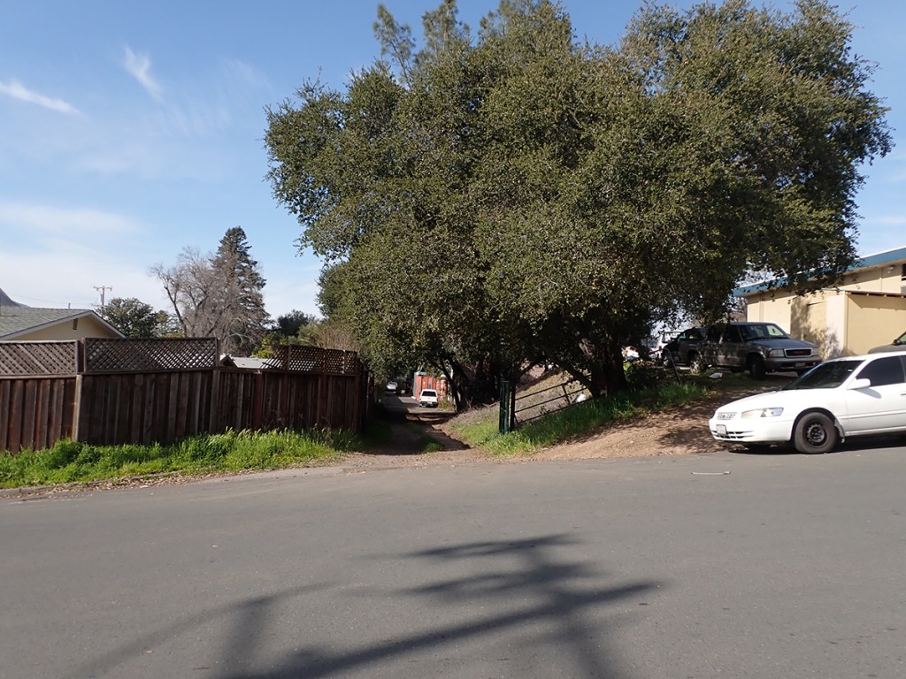 Where Sierra turns east to the Highway the right of way continues north through the Sonoma Mission Inn (originally the Boyes Hot Springs Resort) grounds and past the BHS depot, which land is now the parking lot for the Plaza Center building (More here).