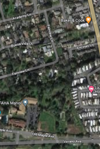 From there it parallels Fairview Ln. (which may have been right-of-way) until it gets to Thompson, where Sierra Dr., formerly Meinke Ave., takes over the roadbed. (More about Sierra and Mienke.) Manzanita St. might have been a spur. It features several buildings that look as if they could have been built by the railroad.