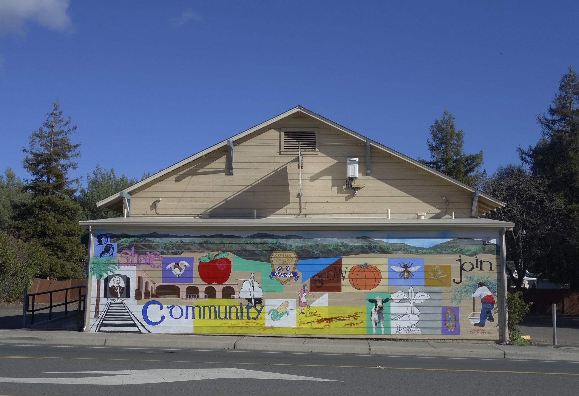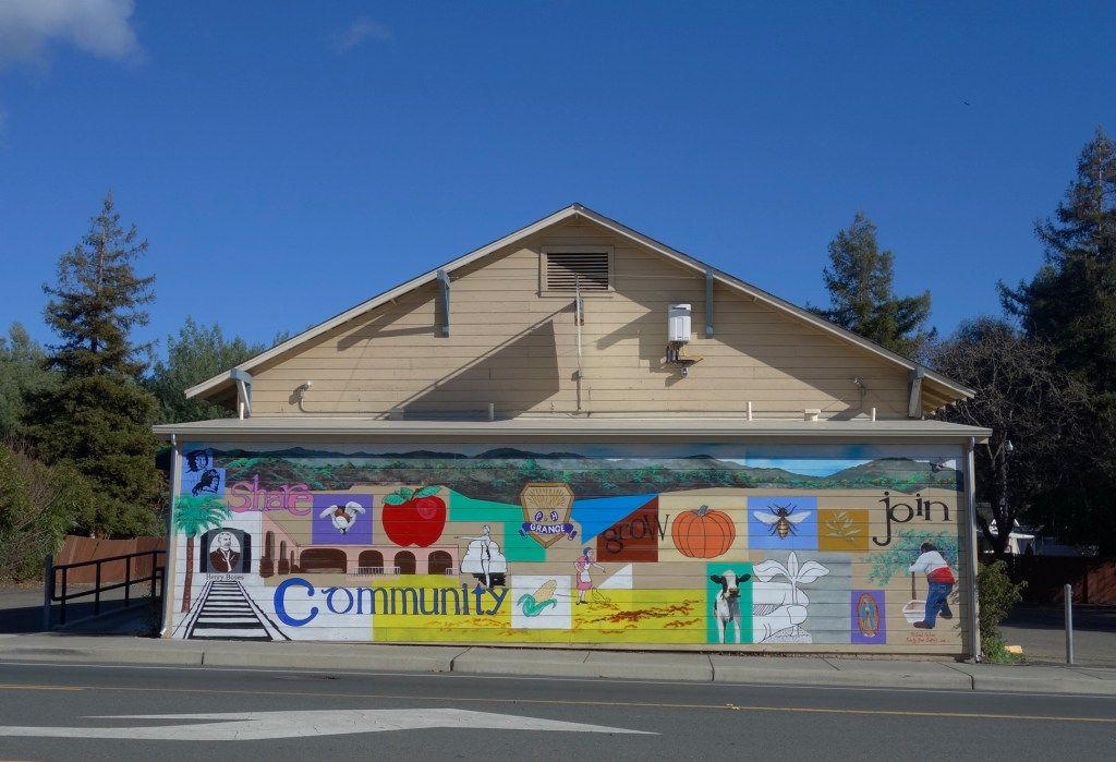 The mural on the front of the Sonoma Valley Grange building, located at 18627 Sonoma Highway. The Grange has owned the building, which was probably originally a dance hall, since 1934. See (https://springsmuseum.org/2022/06/28/the-sonoma-valley-grange-traditionchange-and-renewal/) for more about the Grange. Through the Redevelopment Façade Improvement project, the Grange got funding for the mural in 2010. It was designed by Michael Acker and painted in collaboration with Randy Sue Collins. It depicts a bit of Boyes Hot Springs and Grange history. It being on the west facing wall, it takes a terrific beating from the sun, and has been restored twice.