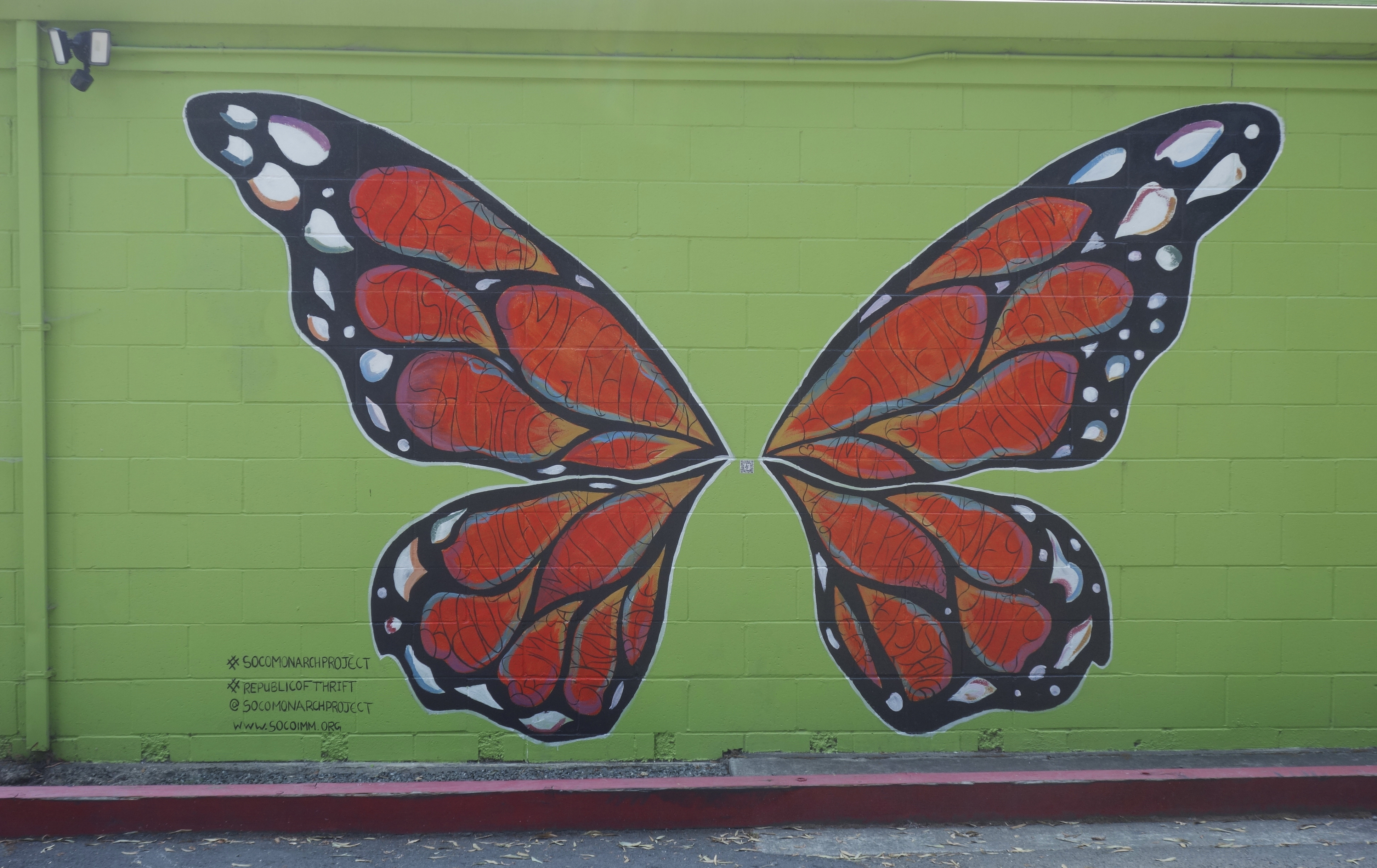 The Republic of Thrift building at 17496 Sonoma Highway has two murals sponsored by the Monarch Project (https://www.socoimm.org/) along with others. On the west facing wall is the giant Monarch butterfly, completed in June 2020. According to the Index Tribune, “Artist Rima Makaryan, just 17 years old, painted a Monarch butterfly as part of “The Monarch Project,” a Sonoma County nonprofit organization working to tell the stories of immigrants and empower the community.” “We are working to have a conversation about immigration through art,” said Makaryan. “Oftentimes immigrants are labeled aliens or talked about negatively. The goal of the Monarch Project is to find beauty in the subject.” The mural, painted on the west-facing wall of the thrift store, features a Monarch butterfly filled with words describing the immigrant experience, such as resilience, hope, amor, sacrifice and fear. Makaryan noted, “The words are meant to embody the journey and diversity of all migrants. It’s all about the beauty of the topic, good and bad.”