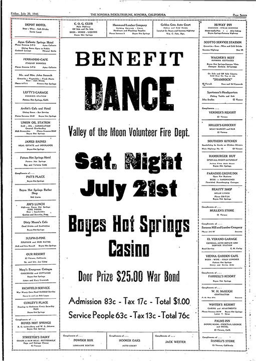 The Depot Hotel, not the one on First Street West in Sonoma, was located on Agua Caliente Road and Lake Street in Agua Caliente. It was probably preceded by Annie’s Resort at the same location, which David Luzzi listed in his liquor application in 1939. Luzzi was listed as the proprietor of the Hotel in an ad in the IT in 1945.