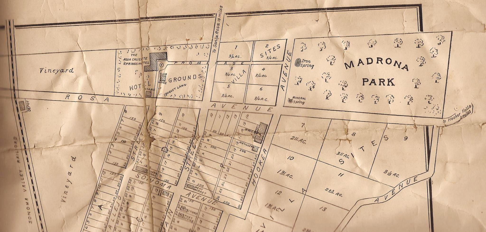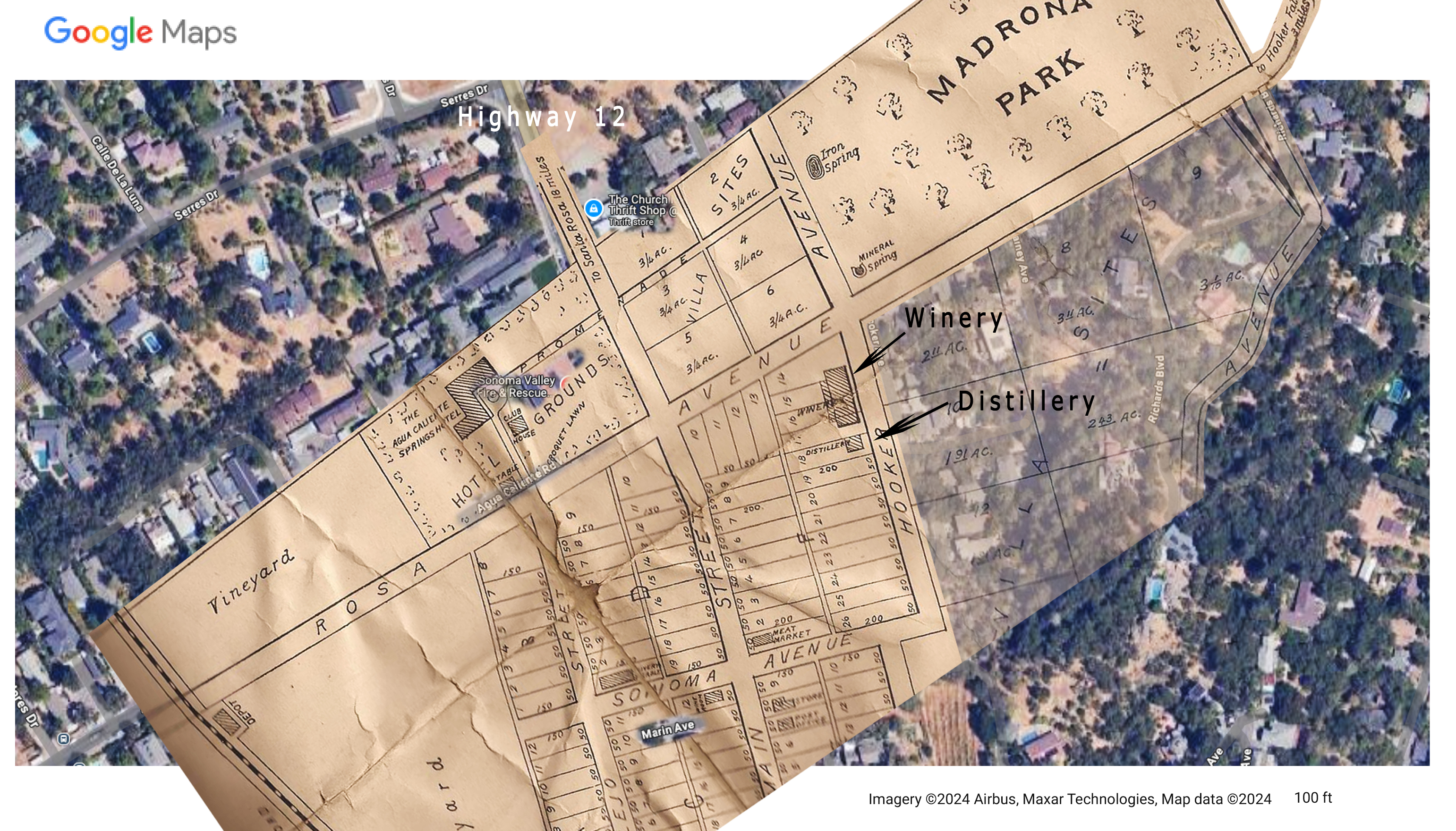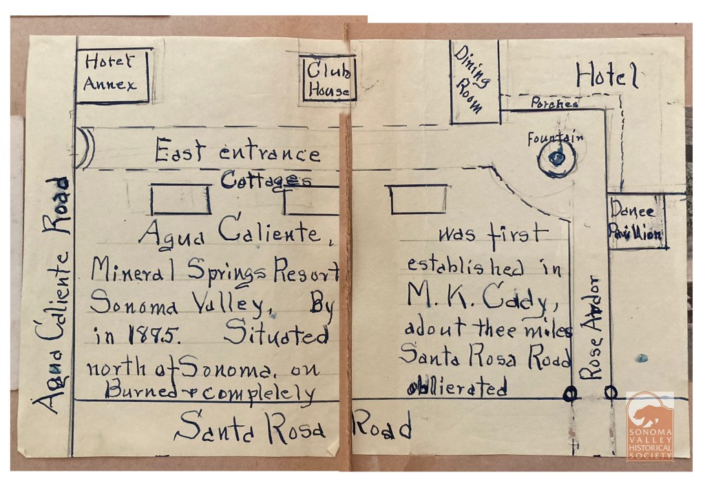 Map from Jeff Gilbert’s collection.Jeff’s map superimposed on the Google map. The resort was located at the intersection of the current Highway 12 and Agua Caliente Road, then called Santa Rosa Avenue. The winery and distillery were on Hooker Avenue, named for General Joseph Hooker, of Civil War fame, who was an early land owner in the area. The Agua Caliente Resort site was later known as Hooker Oaks. Today, the Sonoma Valley Fire Department station is there. The road at upper right is labeled “To Hooker Falls, 3 miles.” Click to enlarge.From a scrapbook at the Marcy House archives, date and author unknown.