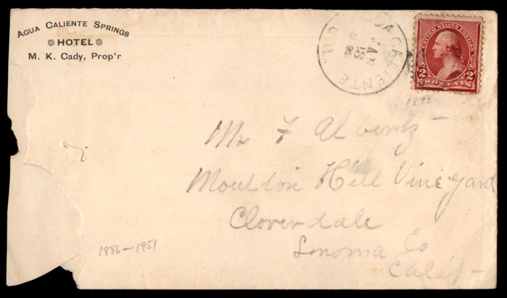 All was not smooth sailing for Mr. Cady. In a September 1893 article in the IT headlined ”Agua Caliente Post Office Squabble. Cady and Morris on Top-Postmaster John Austin Down and in Jail,” we learn that Austin was the owner of a general store in Agua Caliente, which housed the post office. He also ran a bar that competed with Cady’s. Morris was the “mail Messenger” responsible for carrying the mail from the railroad depot to the Post Office. Morris and Austin had bad blood between them stemming from a fist fight the previous July. Morris and Cady wanted to get the Post Office moved to Cady’s’ resort. They accused Austin of opening their mail, and Austin was arrested and taken to jail in San Francisco. Austin claimed he was framed in order get the post office away from him.