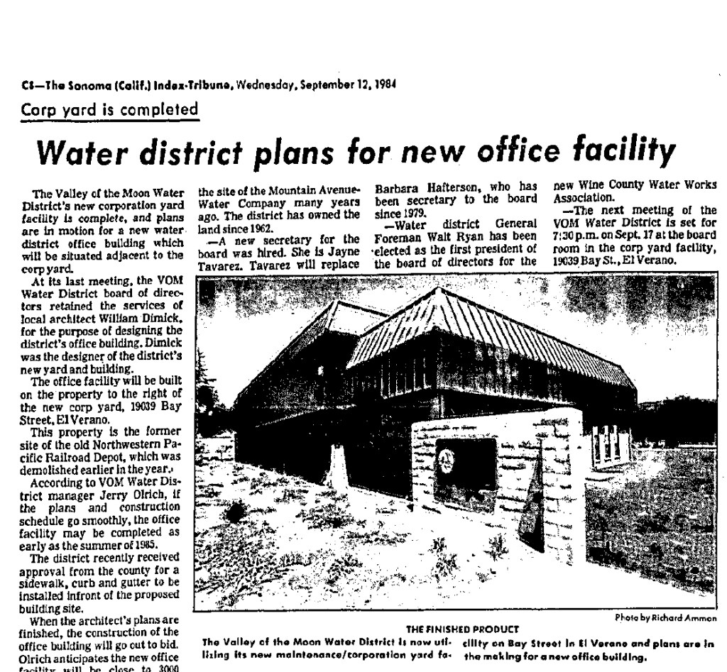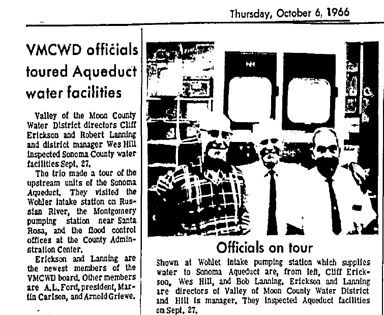 “Acquisition of the Sonoma Water and Irrigation Company and the Mountain Avenue Water System was completed in early 1962 and the Valley of the Moon County Water District started management and operation of the systems on June 1, 1962.” VOMD website.