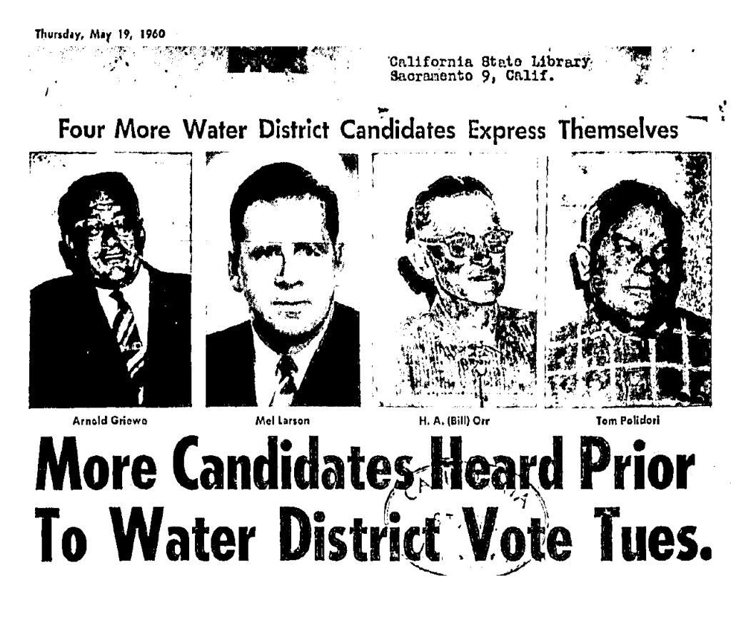 In 1960 voters authorized the establishment of a water district. Candidates for directors at that time were Arnold Griewe, Mel Larson, Bill Orr ,Tom Polidori,Col R. C. Buell, Marin Carlson, A. L. Ford and Nino Vailetti.