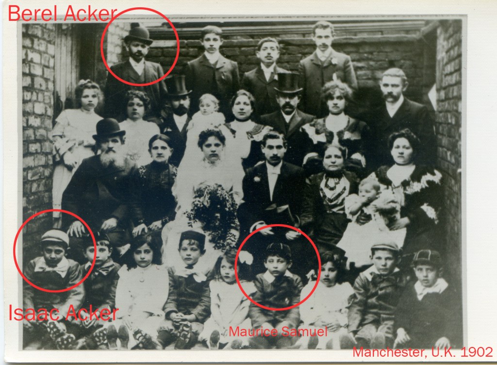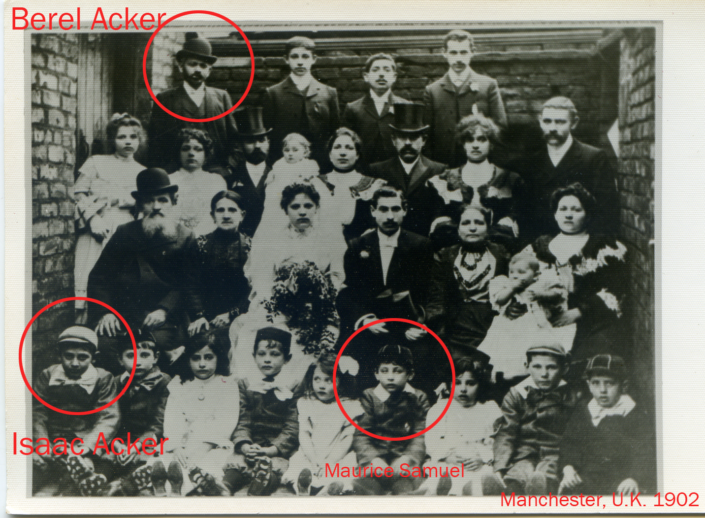 Years ago my father, Marty, gave me a copy of a photograph of the Acker/Samuel(Weissbuch) family, assembled in Manchester, UK around 1900. I don’t know if he knew more about the photo, but he never gave me any details. The family had migrated from Rumania not long before. The group is photographed in front of and hemmed in by, brick walls, in tiers, with a gaggle of kids sitting in the front row. I have been going through folders of family photos lately, (partly so the younger members of my family won’t have to do it some day). I came across a copy of the photograph.